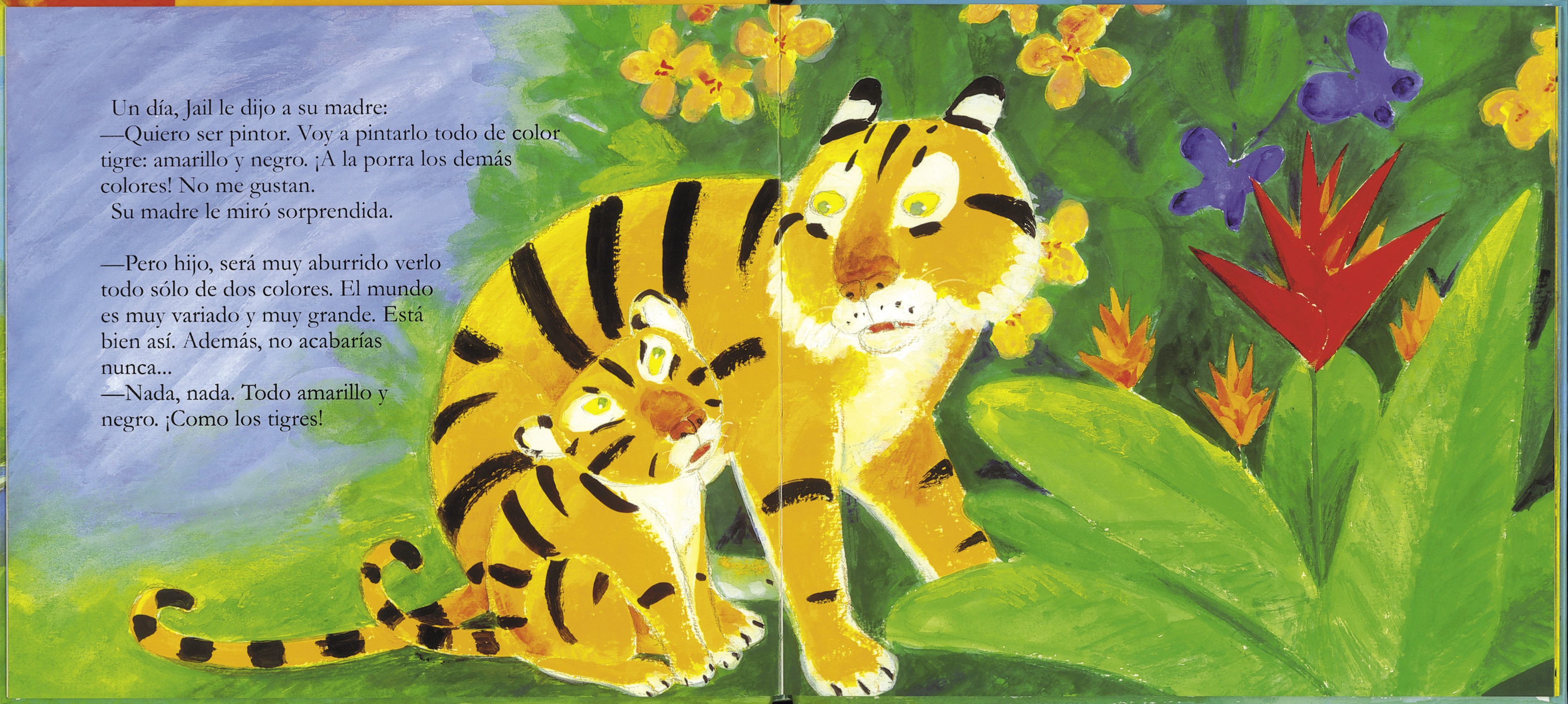 Jail, el tigre, era tan fanático de sus colores (negro y amarillo) que decidió dedicar su vida a pintarlo todo de esa manera. Hasta que un buen día descubrió que estaba equivocado. En este cuento, cuyas páginas ofrecen al lector unas delicadas y preciosas ilustraciones, el autor nos regala una historia de tolerancia y amistad.