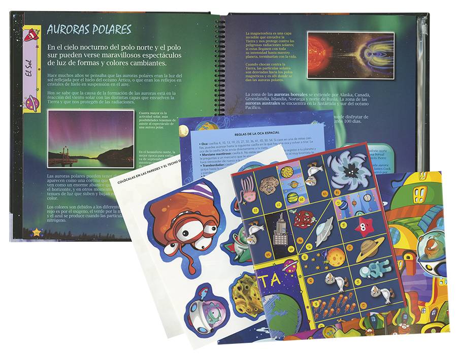 Encuadernación: Cartoné plastif. brillo y holograma, int. con espiral, juego de la oca y pegatinas luminiscentes
