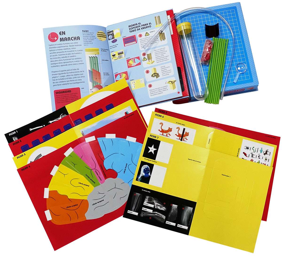 Encuadernación: Cartoné plastificado mate y brillo, cont:libro,pzas.extraibles,tubo ensayo,lupa,globos,gomas elástic