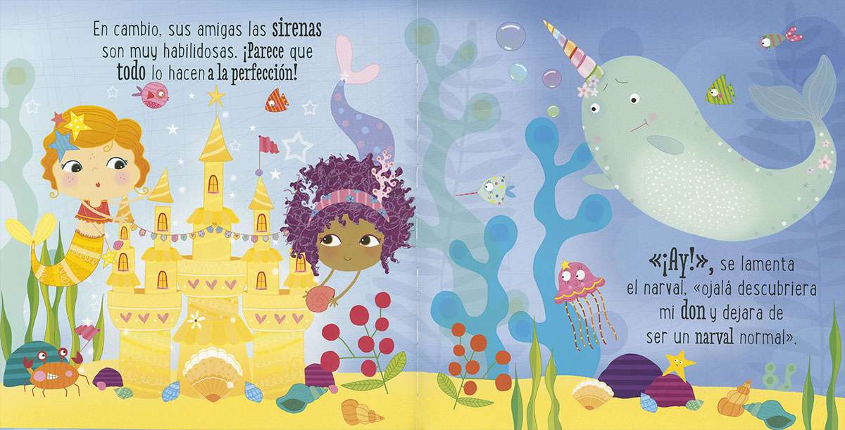 Un cuento submarino repleto de vida y color donde el protagonista es un narval cuya piel podrás ver cambiar de color subiendo y bajando las brillantes lentejuelas.