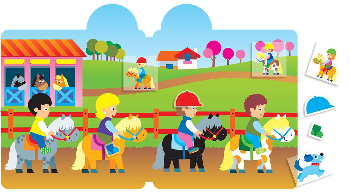 Está amaneciendo y en el club hípico todos se preparan para la llegada de los niños que desean montar en sus ponis favoritos. Los más pequeños de la casa disfrutarán de este simpático cuento mientras completan los escenarios con las pegatinas de vinilo que encontrarán en el interior del libro. Además, como son pegatinas reutilizables, podrán dar rienda suelta a su imaginación y cambiar el cuento una y otra vez.