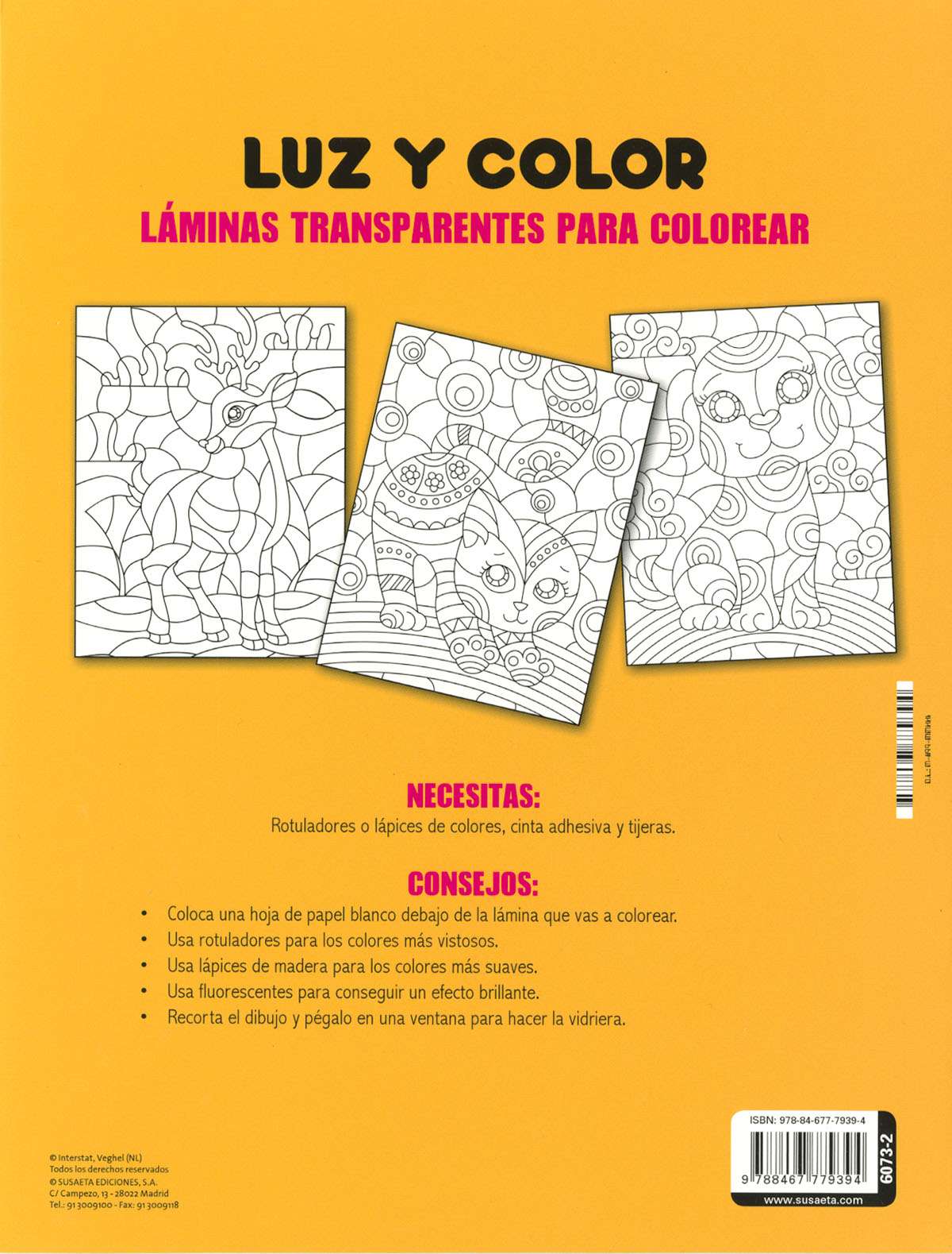 Decora tus ventanas con luminosas ilustraciones coloreando estas láminas de papel transparente que dejan pasar la luz. Sus dibujos de animales, compuestos de diferentes piezas para poder darles distintos tonos e intensidades, brillarán en el cristal como si fuera una original vidriera. Un libro que a los niños les encantará colorear.