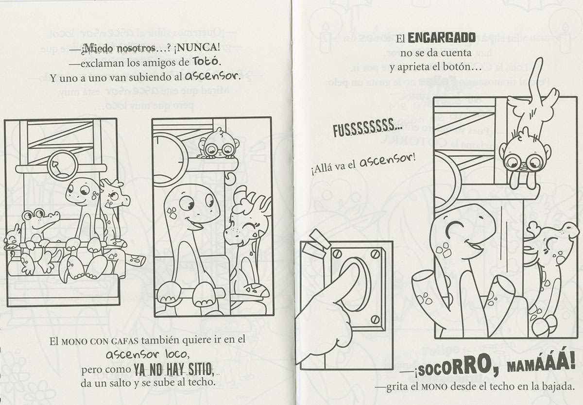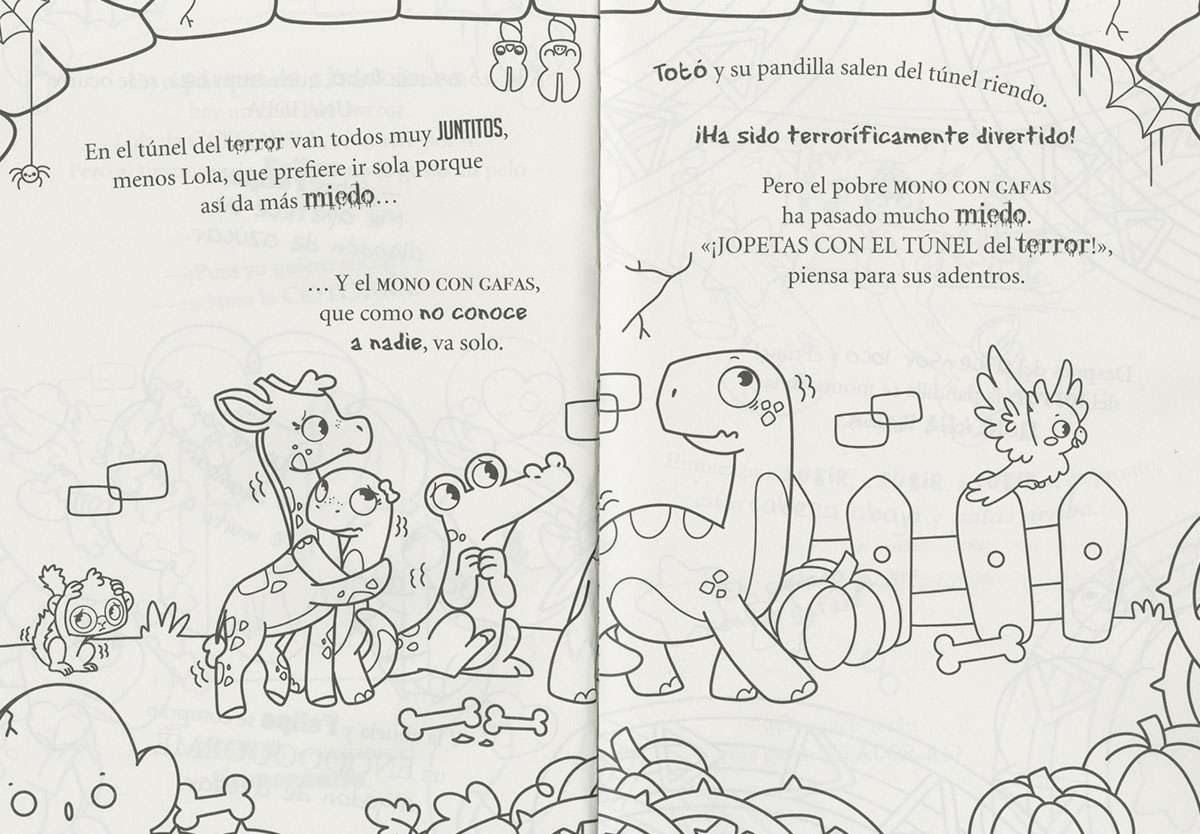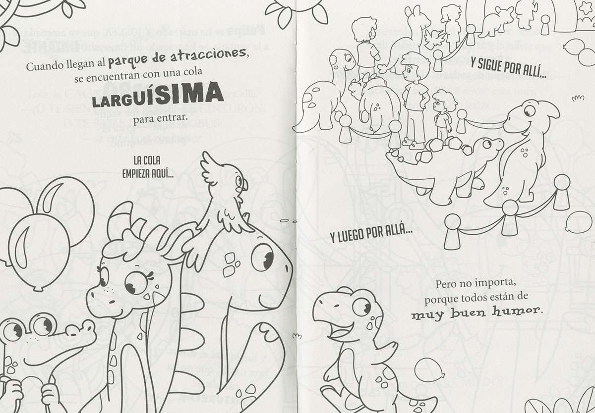 Hoy es un día muy especial para Totó: es su cumpleaños y va a celebrarlo con su familia y sus amigos yendo al parque de atracciones. Colorea al dino Totó y su mundo y diviértete con sus aventuras.