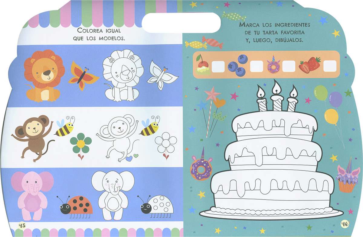 Encuadernación: Tapa blanda con acabado en mate y estampación, con troquel. Con 8 lápices de colores.