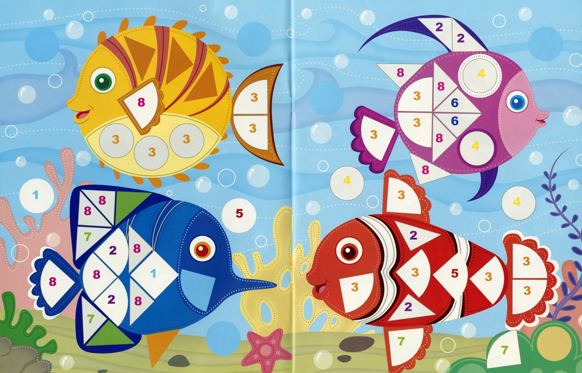 Fíjate en el color del número que aparece en el hueco, busca el color en la página de pegatinas correspondiente, elige la forma correcta y coloca la pegatina en su lugar. Poco a poco, ¡irás completando el dibujo hasta conseguir tu propio mosaico de pegatinas!