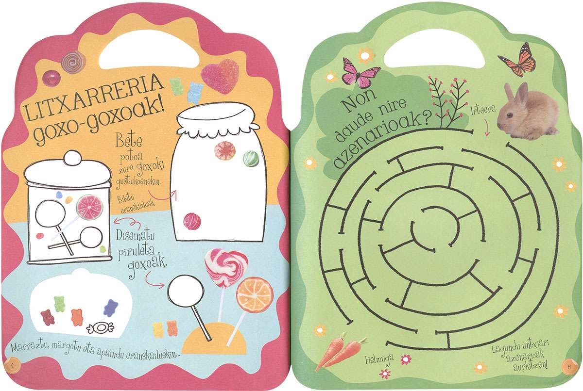 Zabaldu motxila handi hau eta ondo pasa haren orrialdeetako jarduera eta buru-hausgarriekin. Margotu irudiak zure gustuko koloreekin eta jarri eranskailuak dagokien lekuan. Eranskailu ugari dituzu irudiak nahi bezala apaintzeko! Bai dibertigarria!