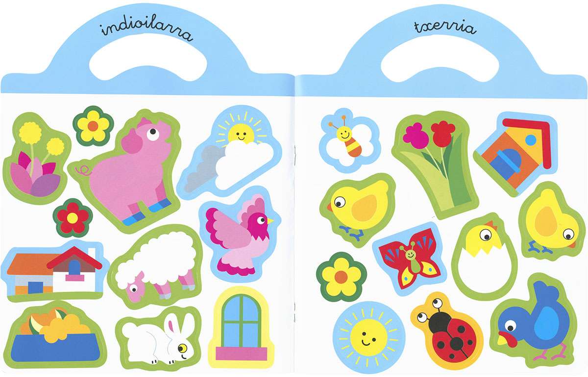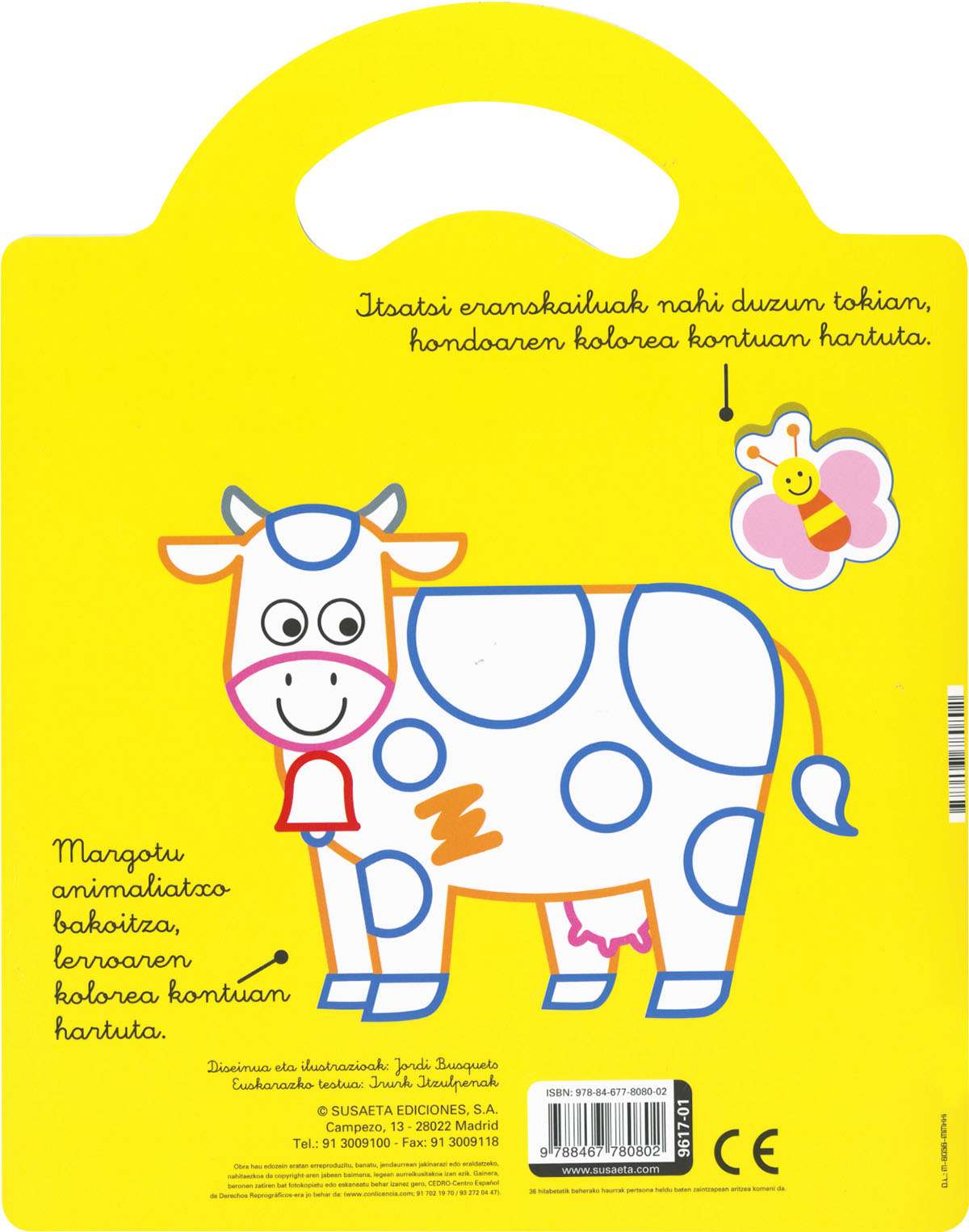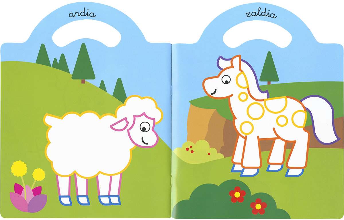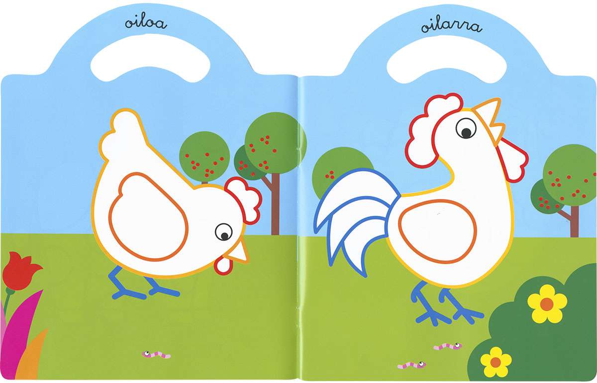 Liburu dibertigarri honetan, haurrek beren baserriko animalia gogokoenak margotu ahalko dituzte, lerroaren kolore berberaz, eta eranskailuak dagokien tokian itsatsi.