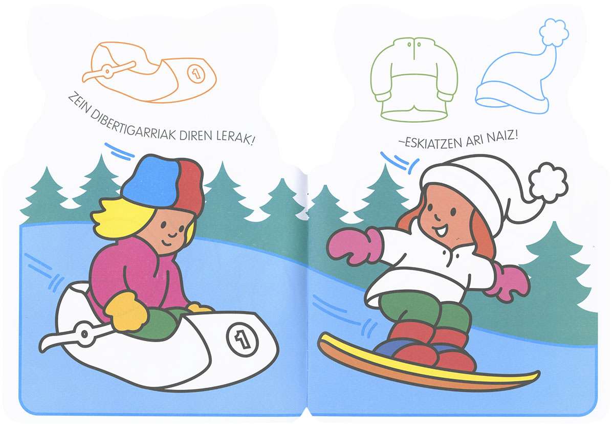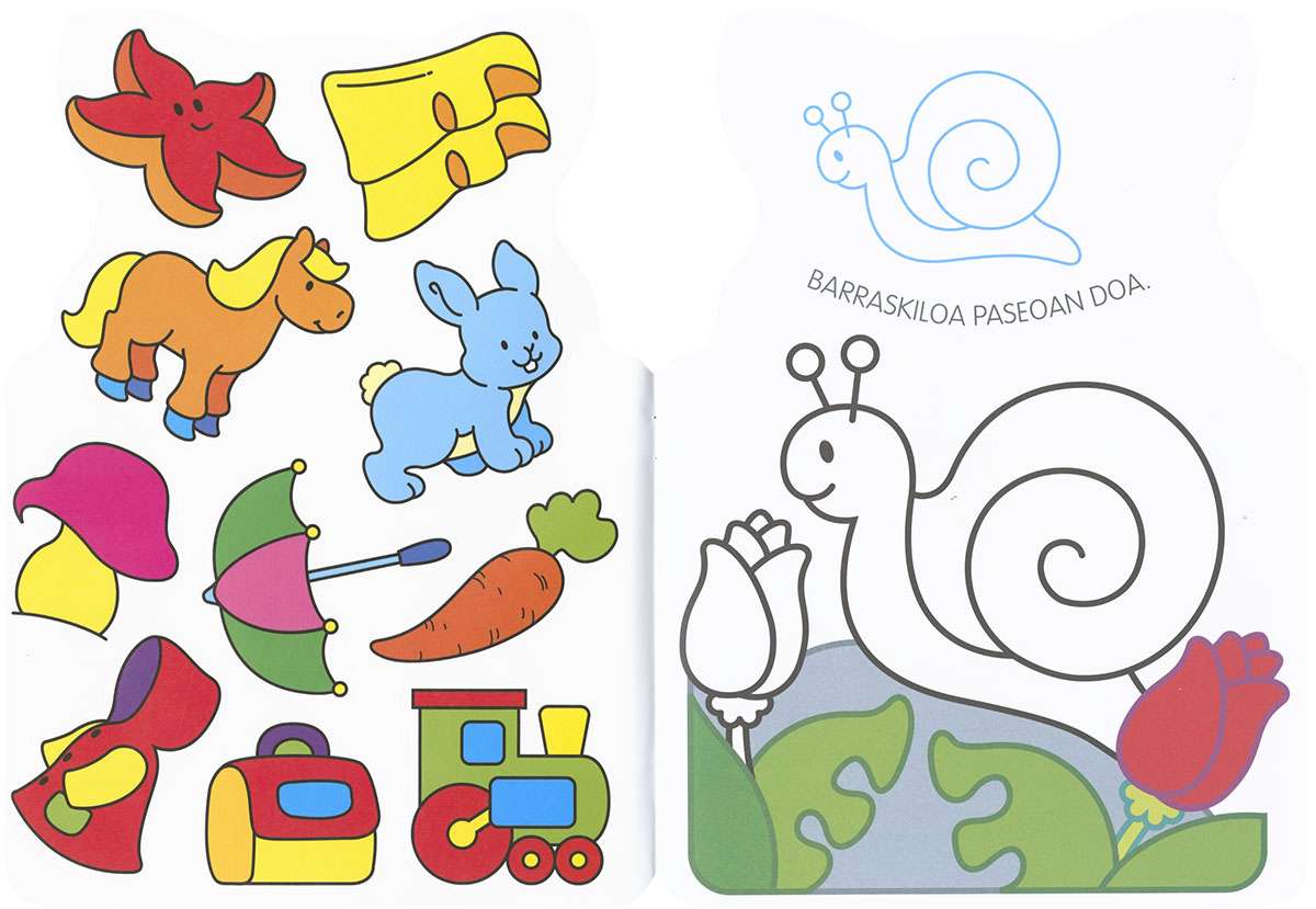 Encuadernación: Kartoi laminatu distiratsu trokelatua, begi mugikorrak dituena, barrualdea pegatinak dituena