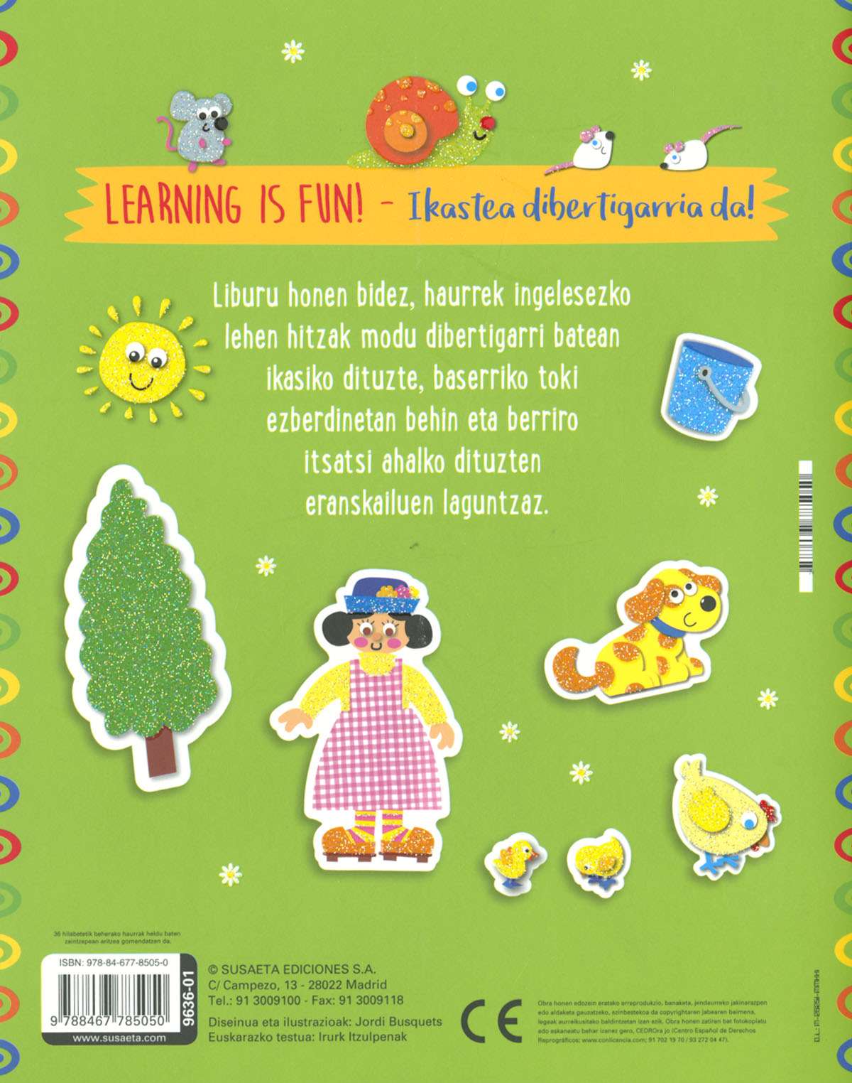 Liburu honen bidez, haurrek ingelesezko lehen hitzak modu dibertigarri batean ikasiko dituzte, baserriko toki ezberdinetan behin eta berriro itsatsi ahalko dituzten eranskailuen laguntzaz.