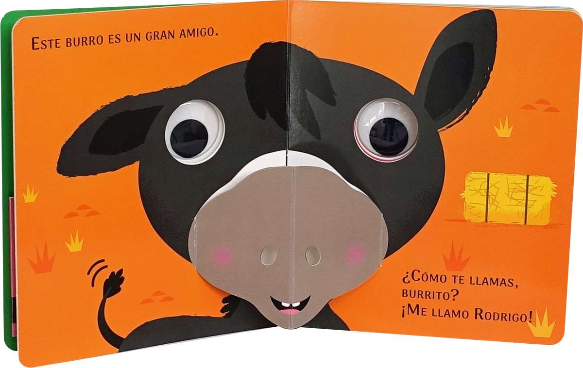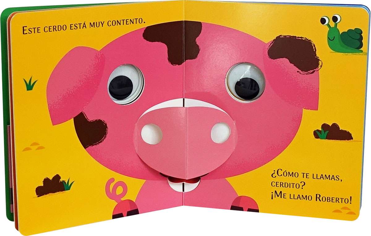 Simpático libro de cartón con ojos de plástico que se mueven y pop-ups para estimular la lectura y despertar el interés por los animales de la granja que tanto gustan a los niños: la vaca, el cerdo, la gallina, el burro, el perro y el pollito.