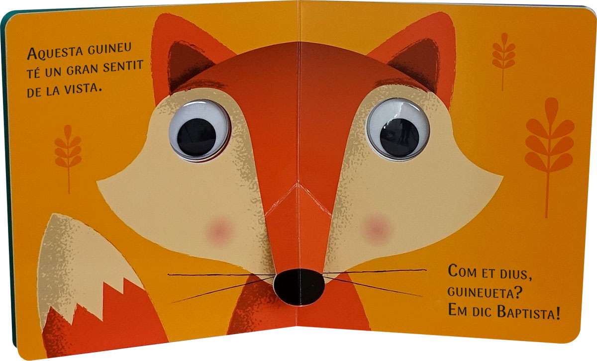 Simpàtic llibre de cartró amb ulls de plàstic que es mouen i pop-ups per estimular la lectura i despertar l'interès pels animals del bosc que tant agraden als nens: l'esquirol, l'ós, el cérvol, la guineu, el mussol i el conill.