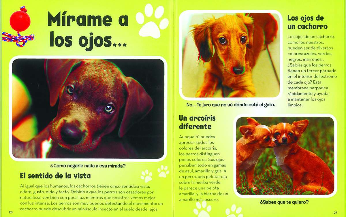 Ponte las gafas 3D y disfruta de las asombrosas imágenes que encontrarás en el interior de este libro repleto de simpáticos cachorros.