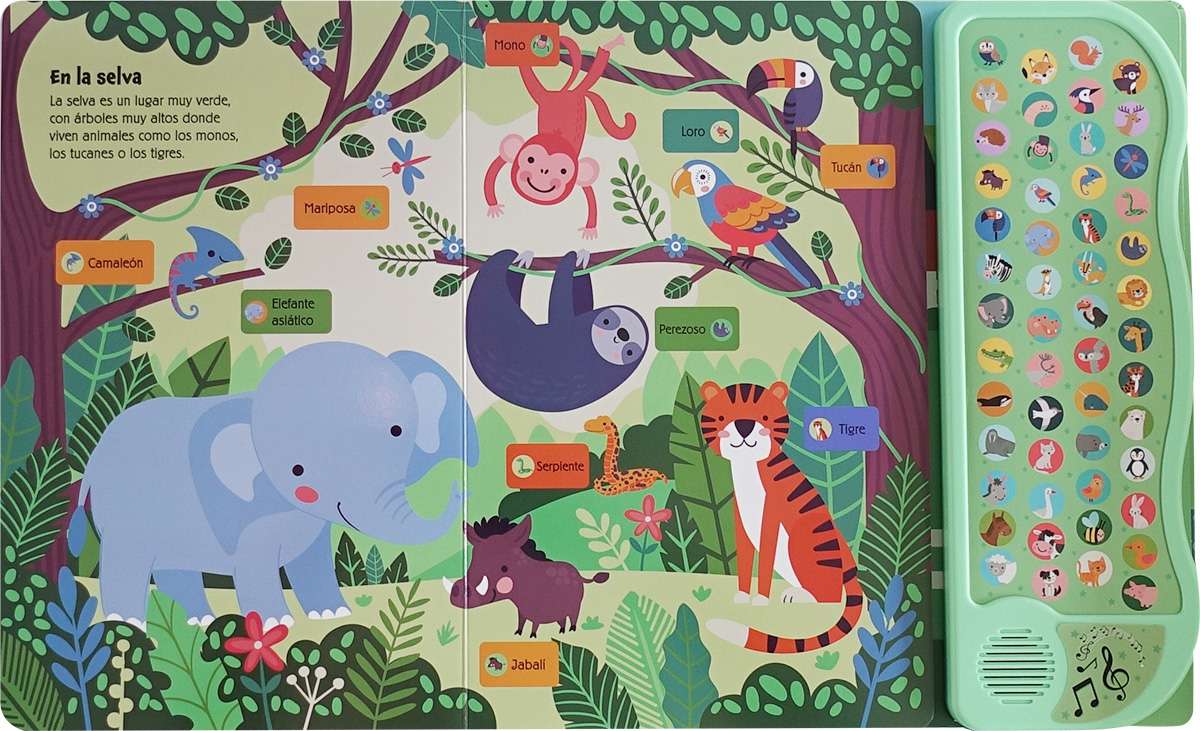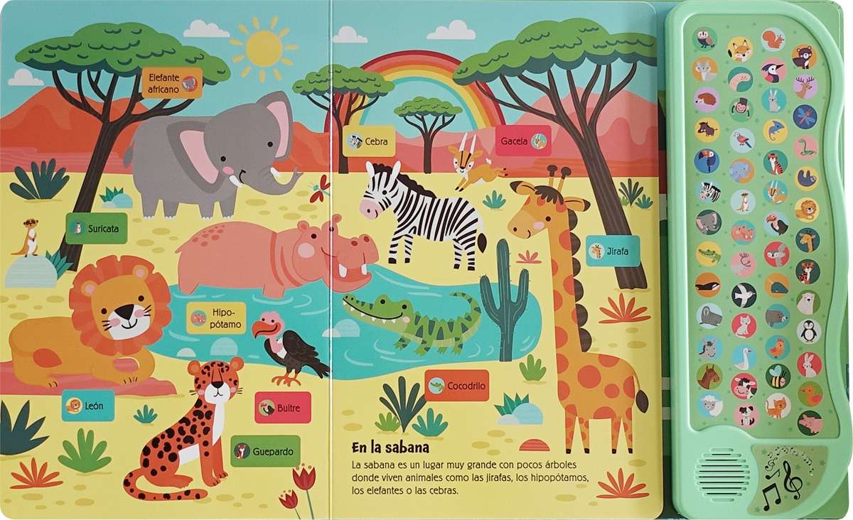 Descubre animales de todo el mundo, escucha cómo suenan y aprende sus nombres con este libro de gran formato y páginas de cartón que incluye 50 sonidos.