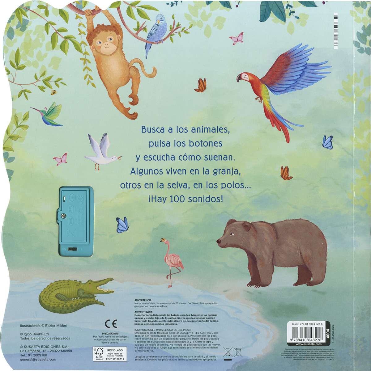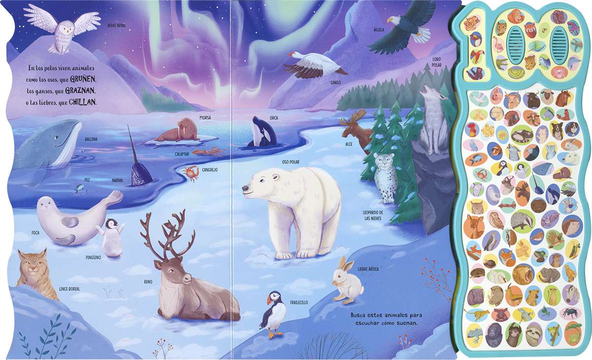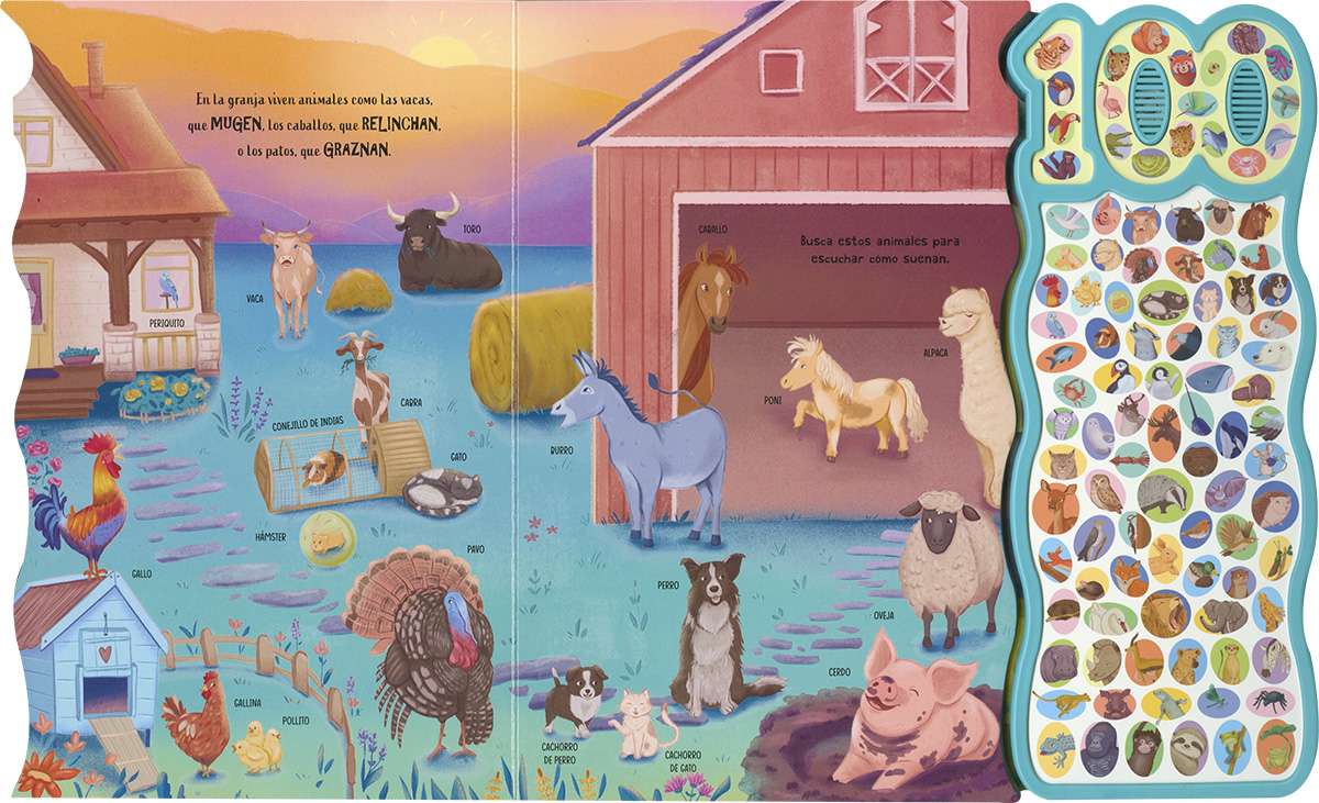 Busca a los animales, pulsa los botones y escuche cómo suenan. Los encontrarás en la selva, en la granja, en los polos... ¡Hay 100, cada uno con su sonido! Un libro infantil de cartón ideal para los pequeños amantes de los animales.