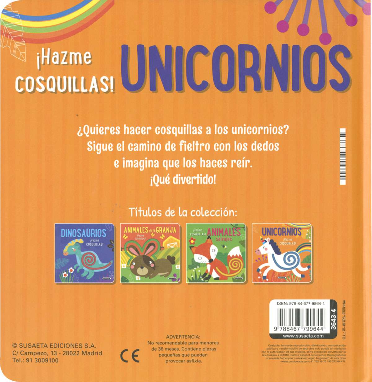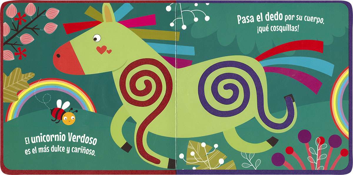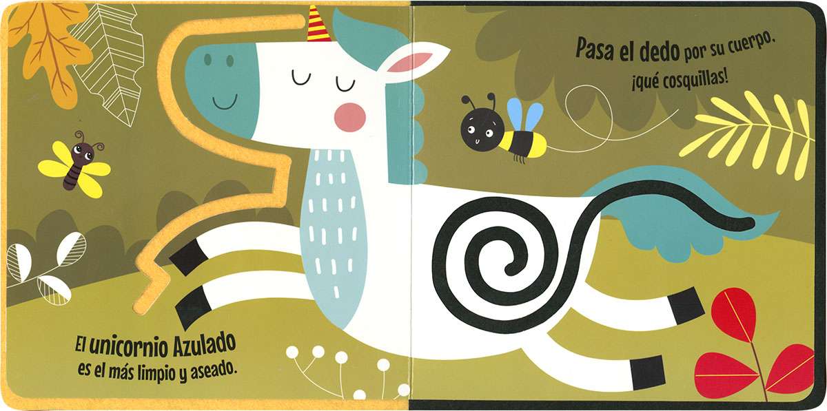 ¿Quieres hacer cosquillas a los unicornios? Sigue con tu dedo el camino de fieltro por el cuerpo de los animales. ¡Seguro que lo disfrutan tanto como tú! Unos libros de cartón infantiles con texturas para tocar y sentir.
