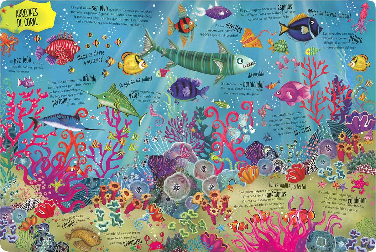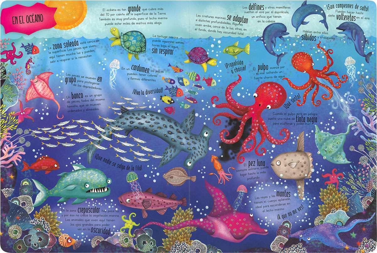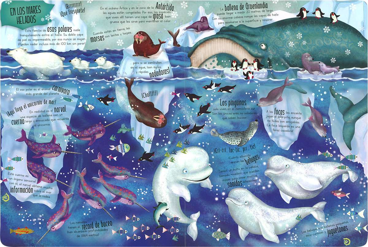 Abre las páginas de este libro gigante y déjate sorprender por sus divertidas ilustraciones. Lee los pequeños textos y descubre los seres tan asombrosos que habitan en el mar.