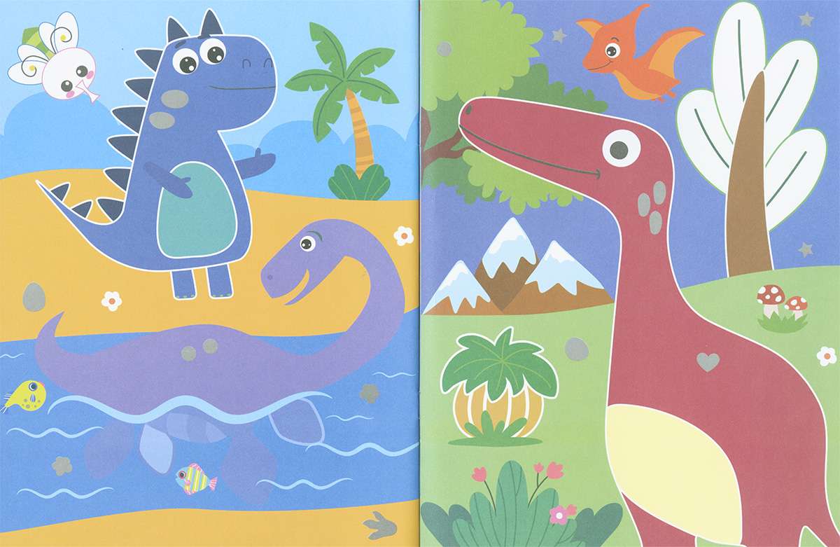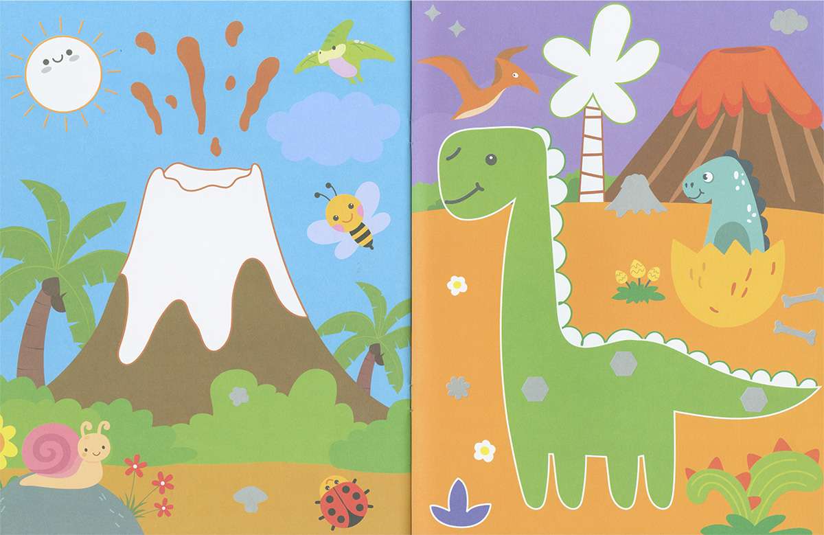 A estos dinosaurios les falta algo... ¿Quizá un poco de brillo? ¡No hay problema! Aquí tienes muchas pegatinas brillantes para adornar las láminas. Complétalas con ellas y coloreando los huecos en blanco que veas. ¡Hay más de 500 pegatinas!