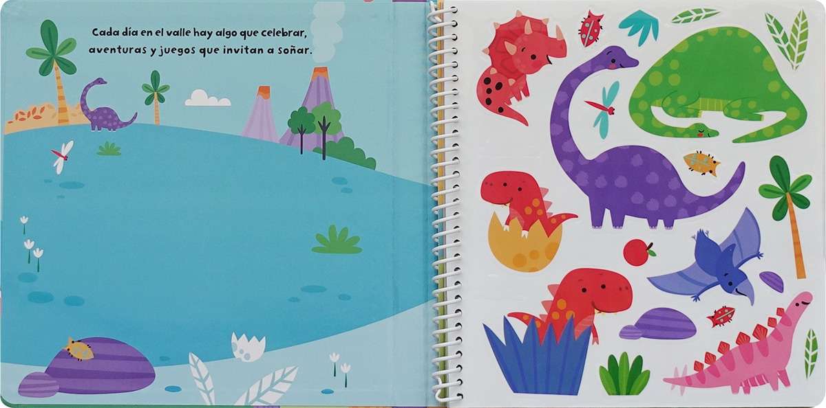 Si te gustan los dinosaurios y disfrutas inventando historias, te gustará este libro de láminas con paisajes prehistóricos, a los que podrás dar vida con las pegatinas de espuma reutilizables que se incluyen. ¡Imagina, pega y crea todas las veces que quieras!
