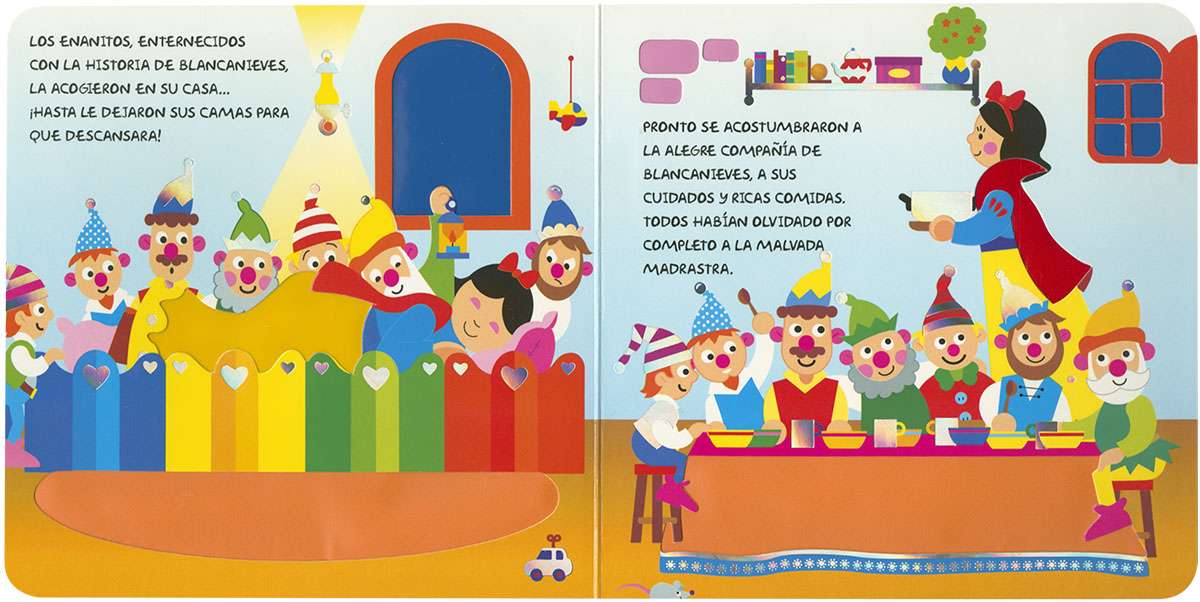 La historia de la dulce Blancanieves y los siete enanitos en un libro lleno de diferentes texturas para tocar y sentir mientras disfrutas del cuento.