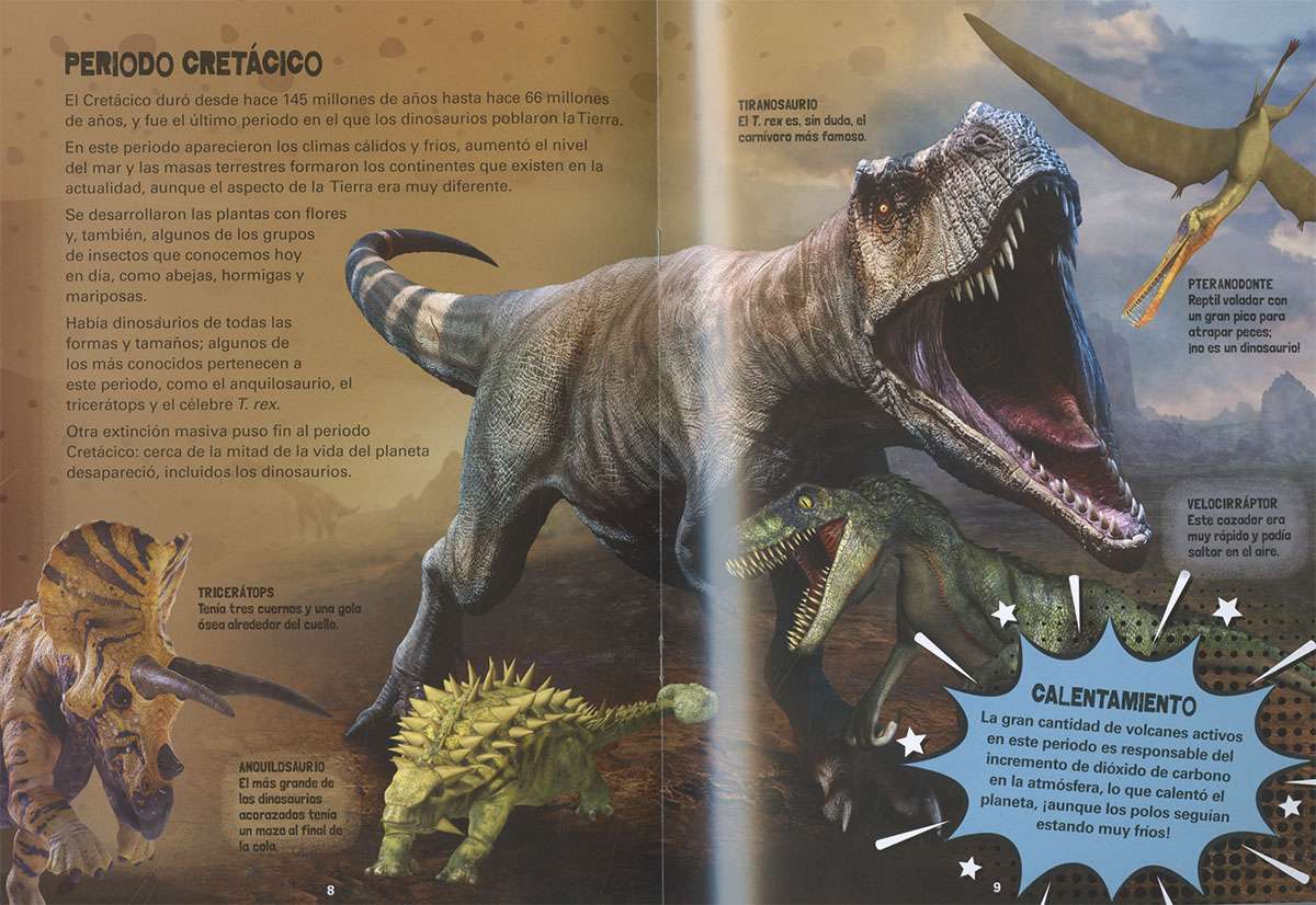 Encuadernación: Cartón plastificado brillo con libro,roca con tres fósiles de dinosaurio, martillo, cincel y brocha