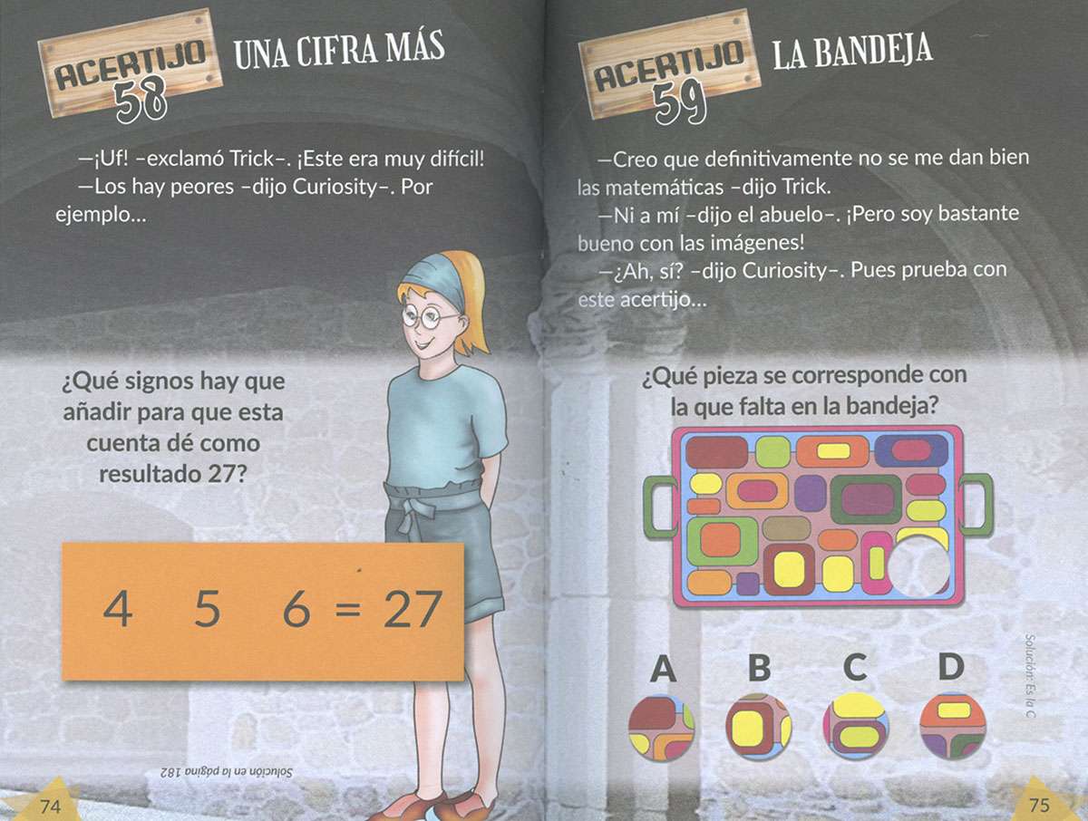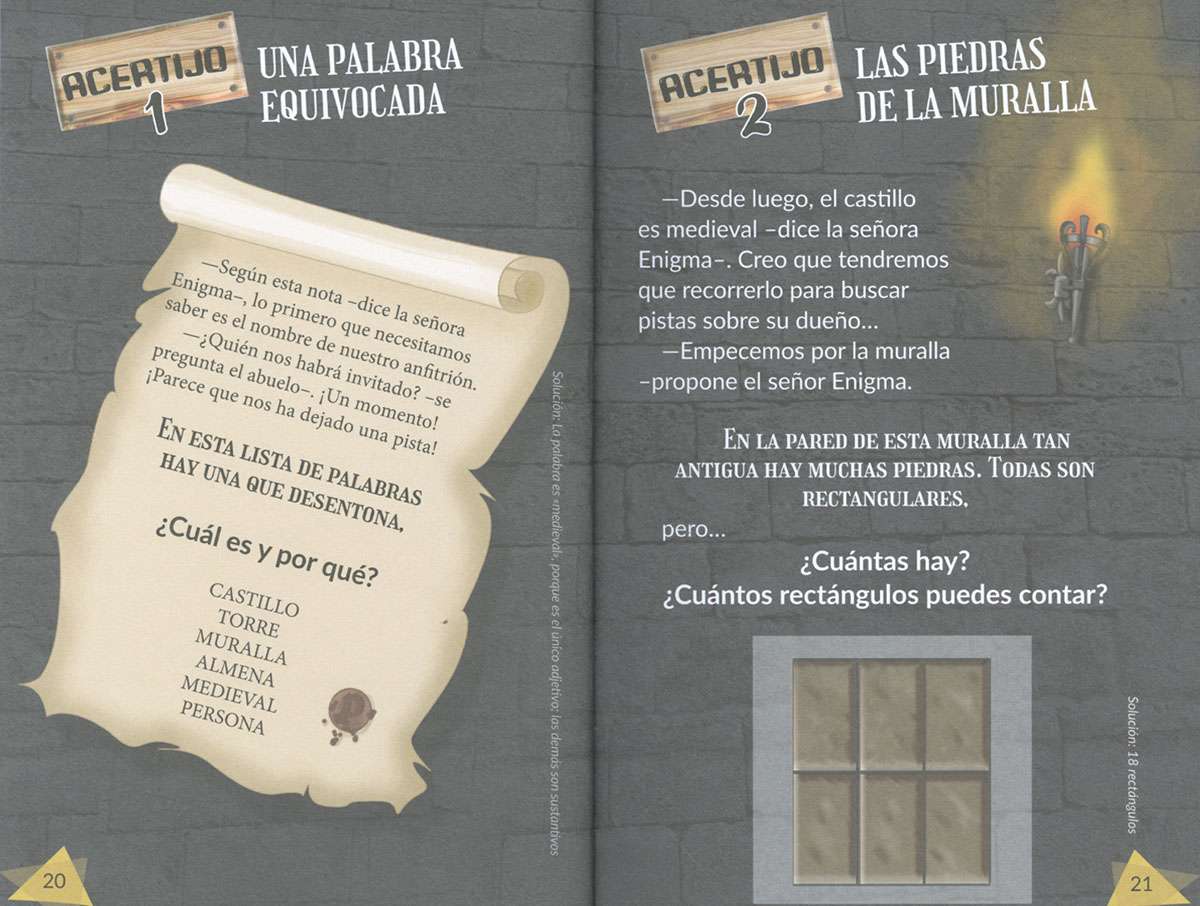 Cuando la familia Enigma recibió una misteriosa carta de un desconocido invitándoles a pasar un día en aquel castillo medieval no lo dudaron. Tan solo tenían que subir al tren y dejarse llevar hasta la estación medio abandonada donde les esperaba un coche de caballos. El silencioso cochero los condujo hasta la puerta del formidable castillo y cruzó al galope el puente levadizo. Los Enigma bajaron a tierra y, al cruzar la pasarela, el puente se levantó y la pesada reja de hierro cayó estrepitosamente dejándolos encerrados en el castillo con una simple nota: «Para salir de este castillo solo hay que descubrir tres cosas: quién os invitó, dónde escondió la llave y qué puerta hay que abrir... ¡Buena suerte!». ¡Tendrás que superar los 182 acertijos, retos matemáticos, juegos y pasatiempos de este libro! ¿Te animas?