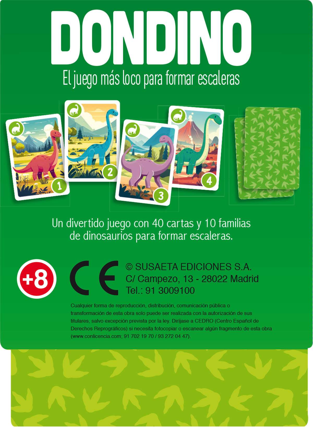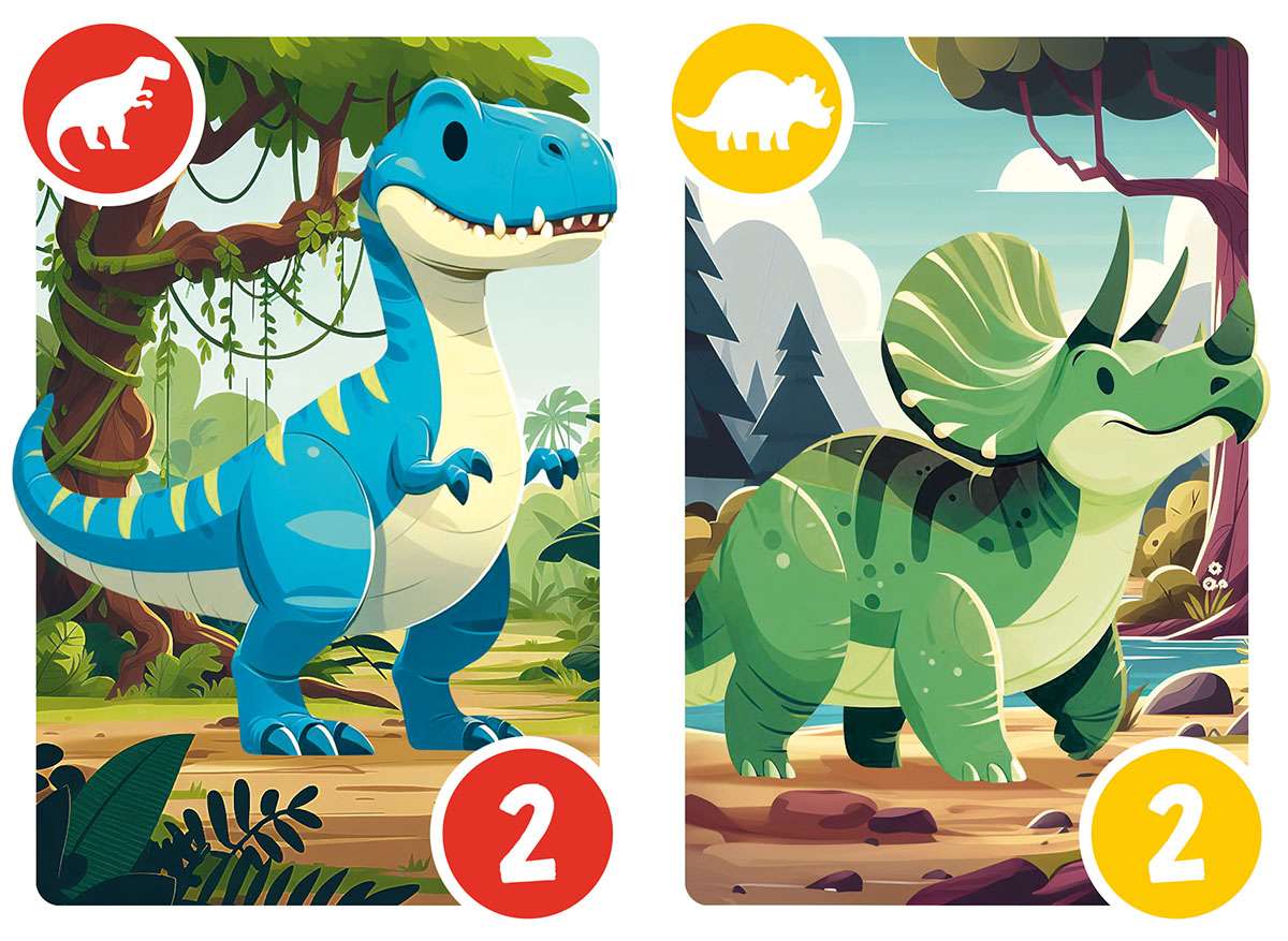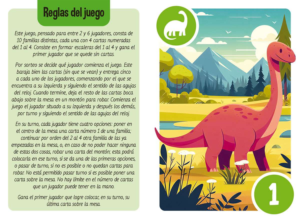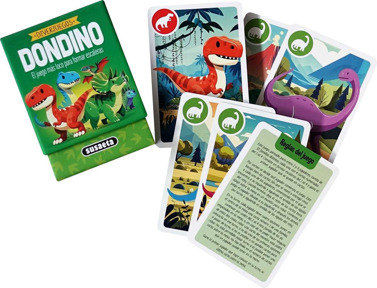 El juego de escaleras prehistóricamente loco. Un divertido juego con 40 cartas y 10 familias de dinosaurios para formar escaleras. ¿Te atreves a intentarlo?