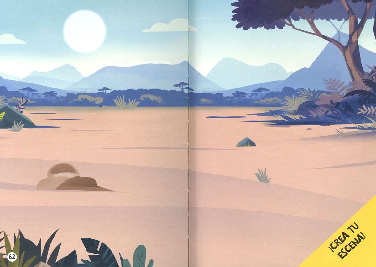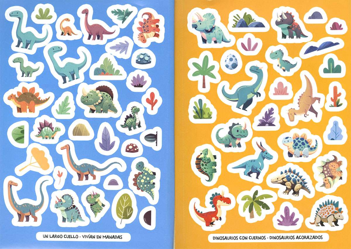 Descubre el fascinante mundo de los dinosaurios y diviértete creando un montón de escenas diferentes con las pegatinas que incluye el libro y que podrás colocar sobre los distintos fondos.