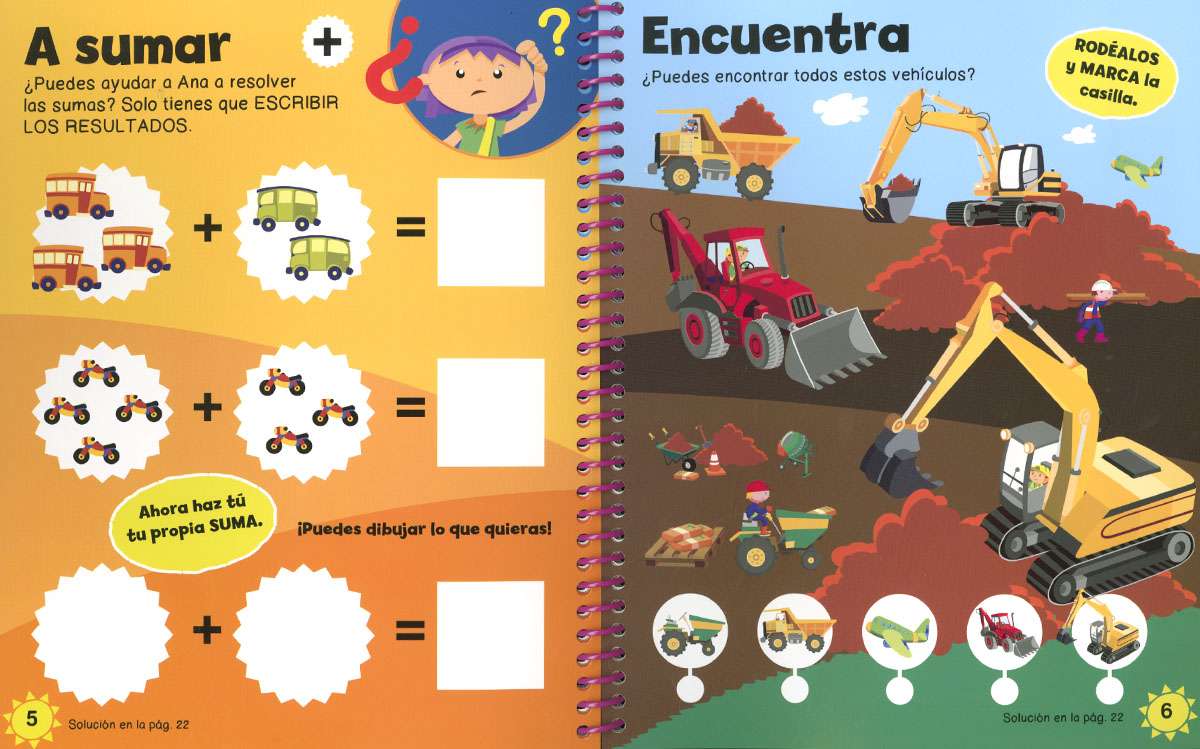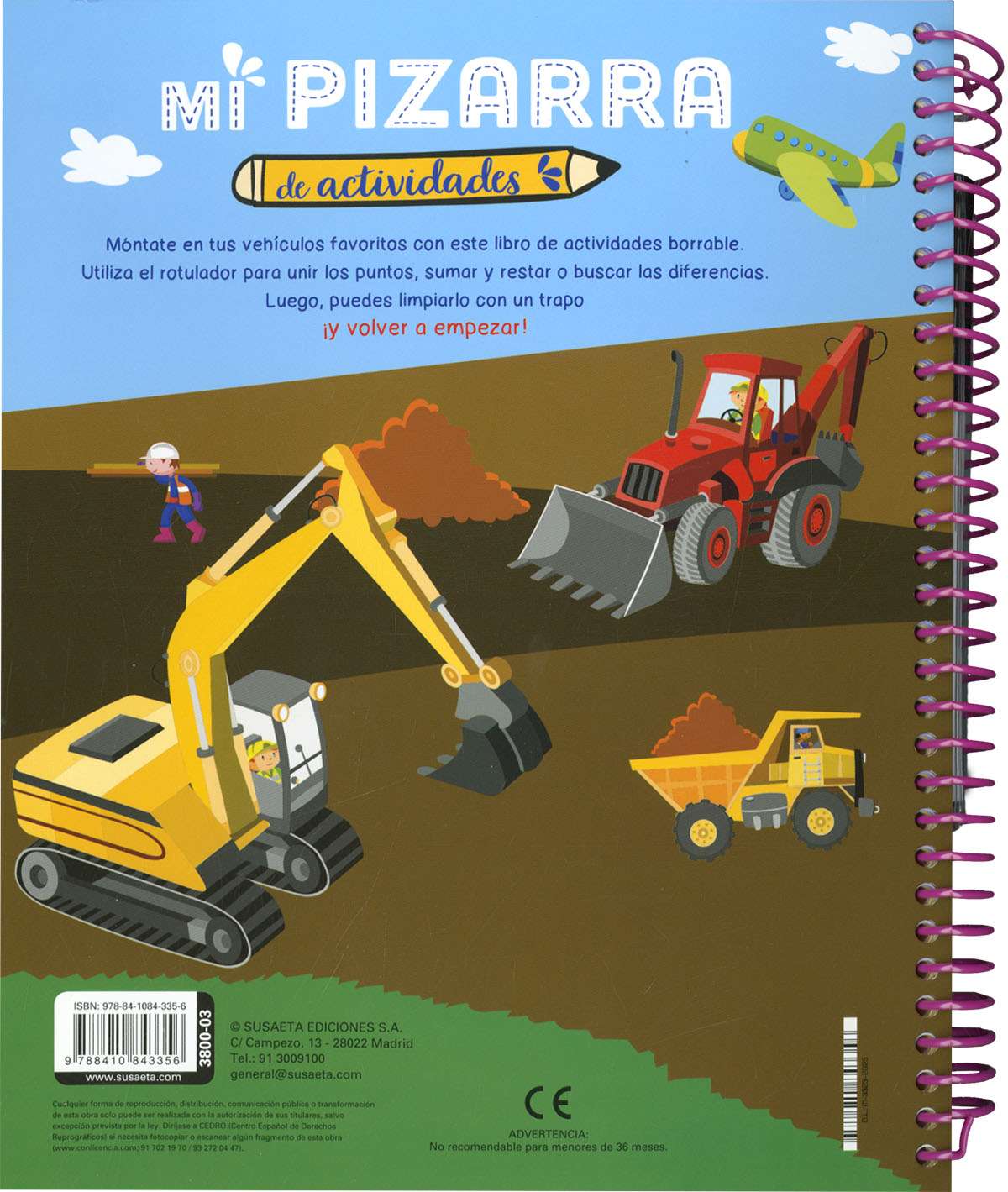 Un libro de espiral a todo color lleno de actividades relacionadas con los vehículos, que incluye un rotulador borrable para que la diversión no tenga fin.