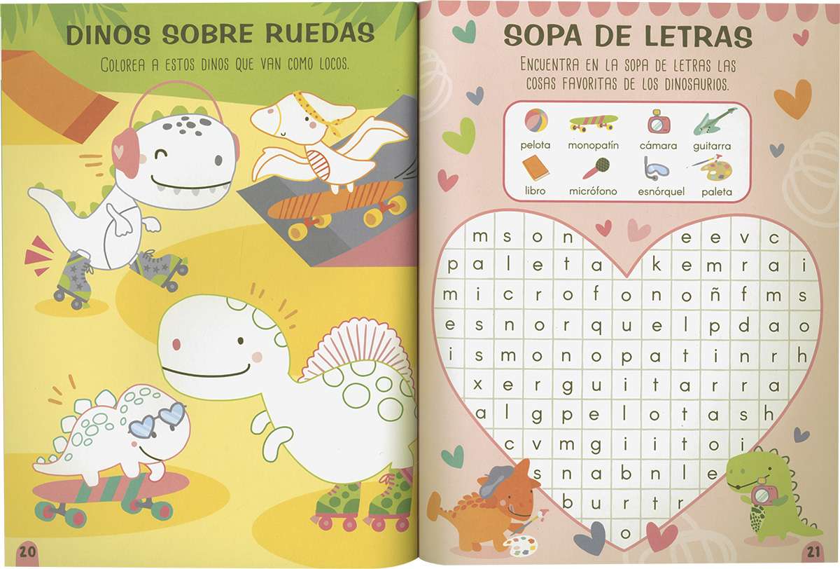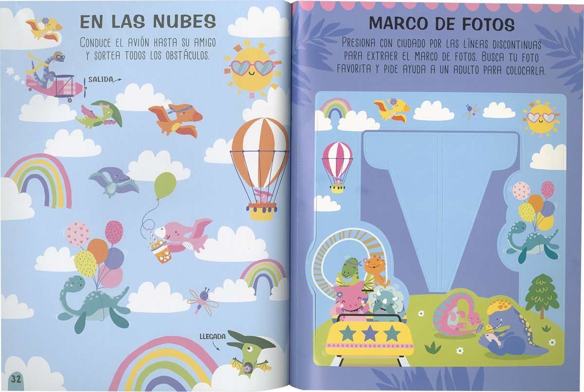 Un libro repleto de actividades de dinosaurios para divertirte con ellos, que incluye piezas precortadas con las que montar puzles y pegatinas de gel para adornar tus lugares favoritos.