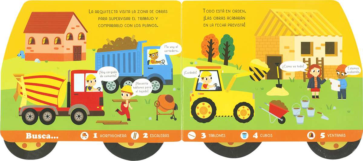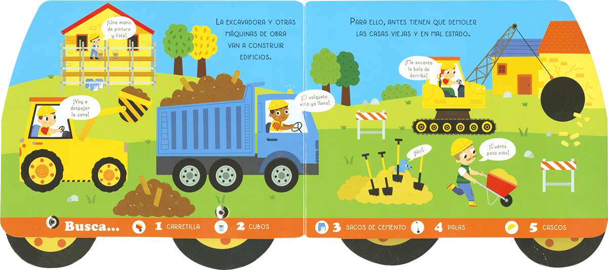¡Súbete a nuestra excavadora y vamos a ltrabajar! Hay muchas obras en esta ciudad. ¿Quieres sabes adónde iremos? ¡No te lo pierdas! Un libro de cartón con ruedas: ¡para leer y jugar!