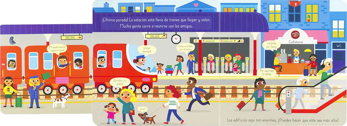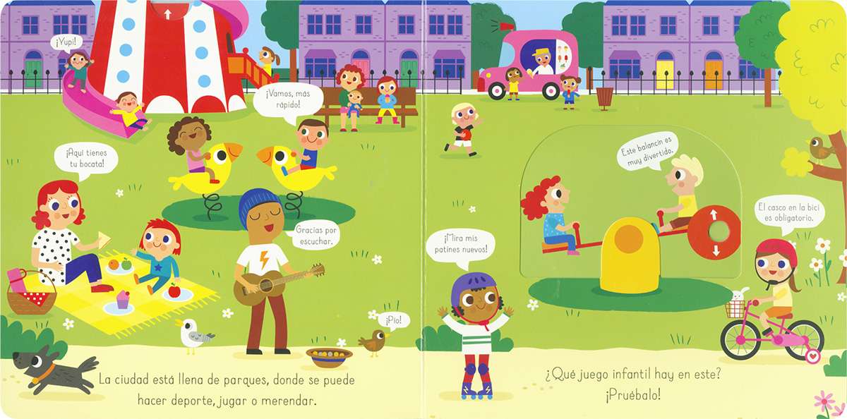 Explora la ciudad con este libro infantil de cartón. Tiene lengüetas para tirar de ellas y otras piezas que se deslizan y que ocultan escenas en la estación, en el parque, en el hospital o en el colegio. ¡Lee y vive la vida en la metrópoli!