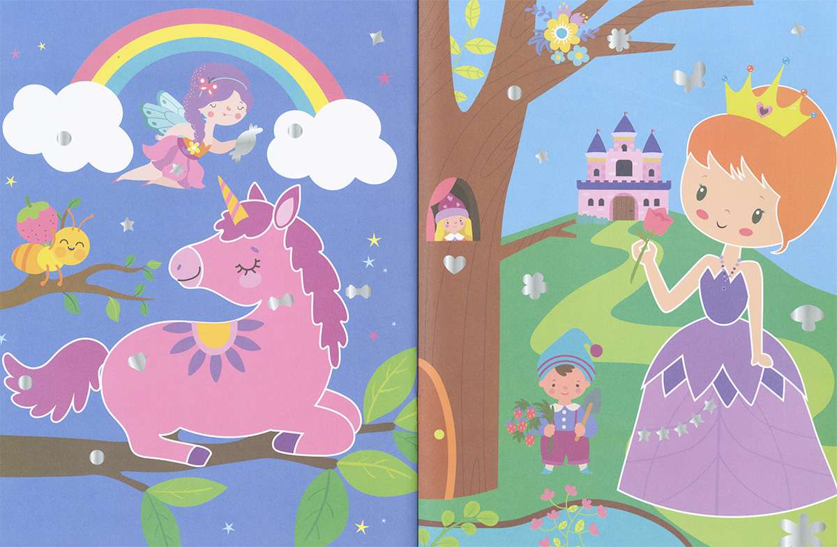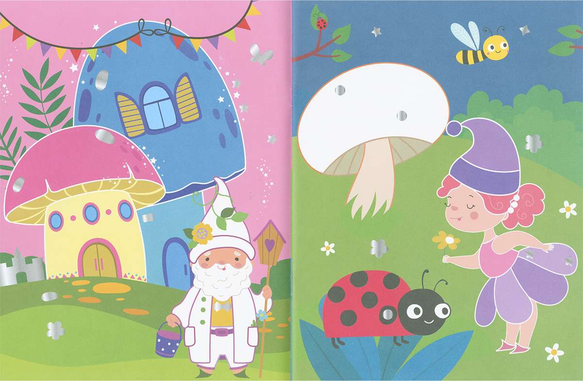 A estas hadas les falta algo... ¿Quizá un poco de brillo? ¡No hay problema! Aquí tienes muchas pegatinas brillantes para adornar las láminas. Complétalas con ellas y coloreando los huecos en blanco que veas. ¡Hay más de 500 pegatinas!