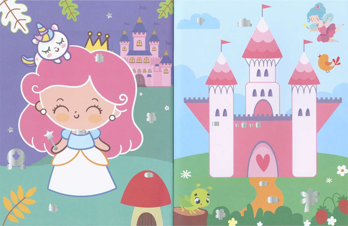 A estas princesas les falta algo... ¿Quizá un poco de brillo? ¡No hay problema! Aquí tienes muchas pegatinas brillantes para adornar las láminas. Complétalas con ellas y coloreando los huecos en blanco que veas. ¡Hay más de 500 pegatinas!