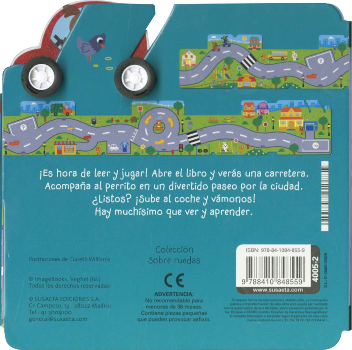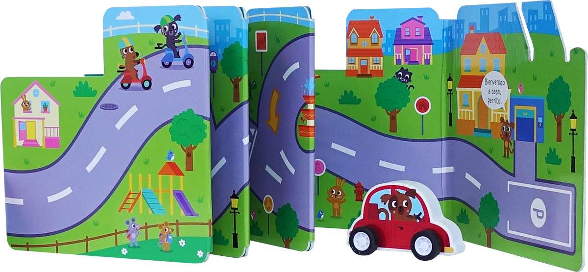 Un libro de cartón desplegable para leer, jugar y aprender: Despliégalo y juega con el coche de juguete conduciéndolo por la carretera que recorre la ciudad.