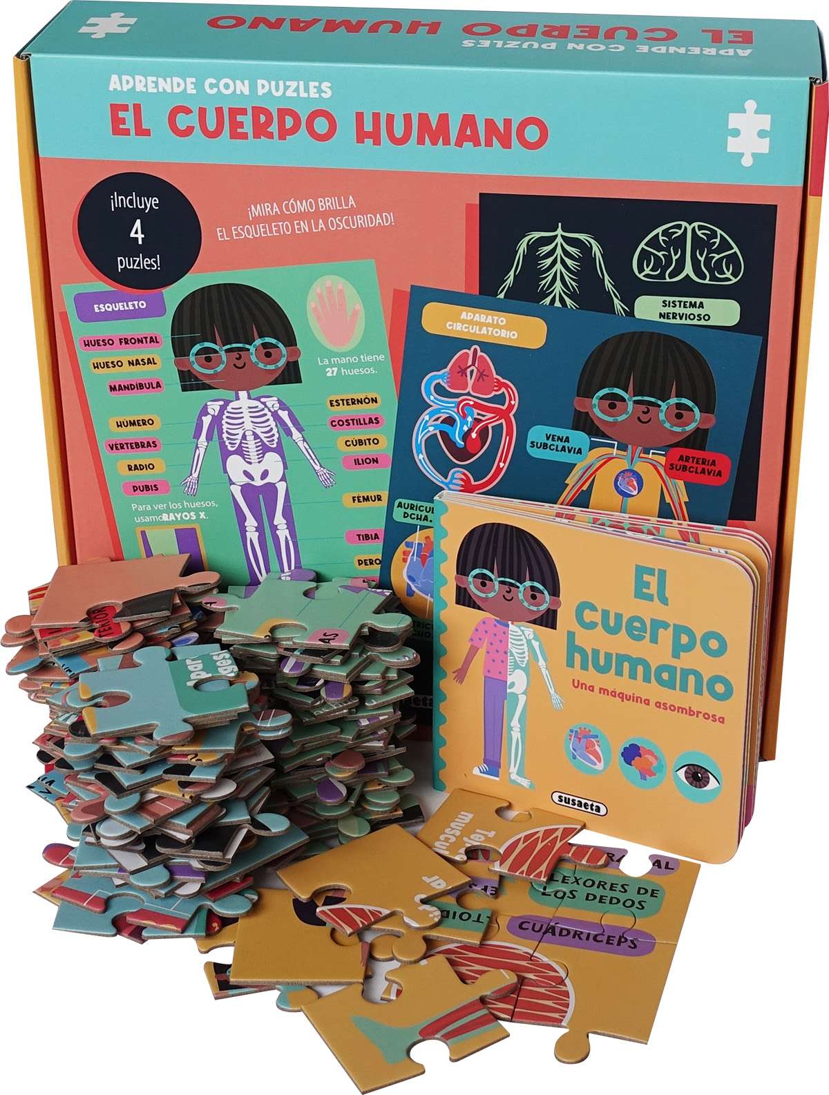 Esta alucinante caja contiene 4 puzles del cuerpo humano. Completa cada uno para descubrir los datos brillantes ocultos y aprende todavía más con el libro ilustrado que contiene. ¡Ideal para futuros científicos!