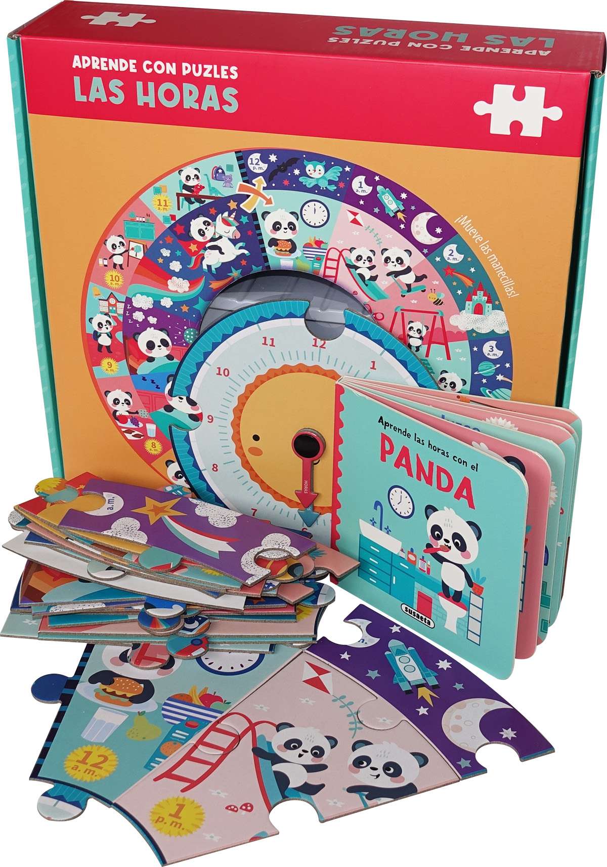 Aprende a decir la hora con el panda. Acompáñalo un día entero, desde que se levanta hasta que se acuesta. El puzle es un reloj que muestra sus actividades diarias, hora a hora. ¡Incluye también un libro ilustrado!