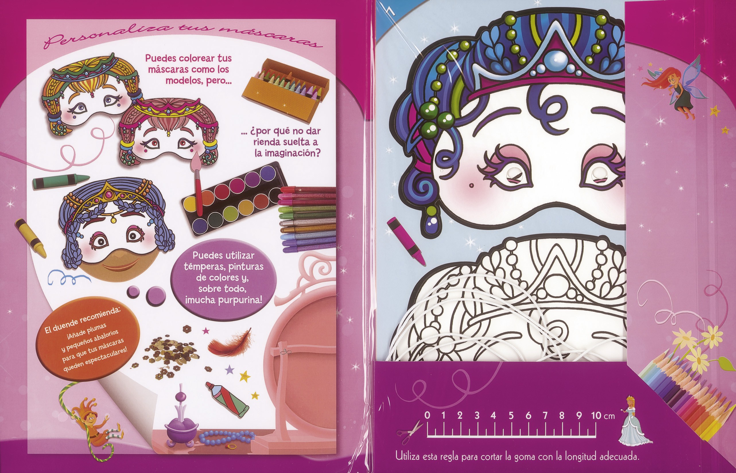 Encuadernación: Carpeta plastificada mate con 6 máscaras decoradasy 6 para decorar, precortadas y goma elástica