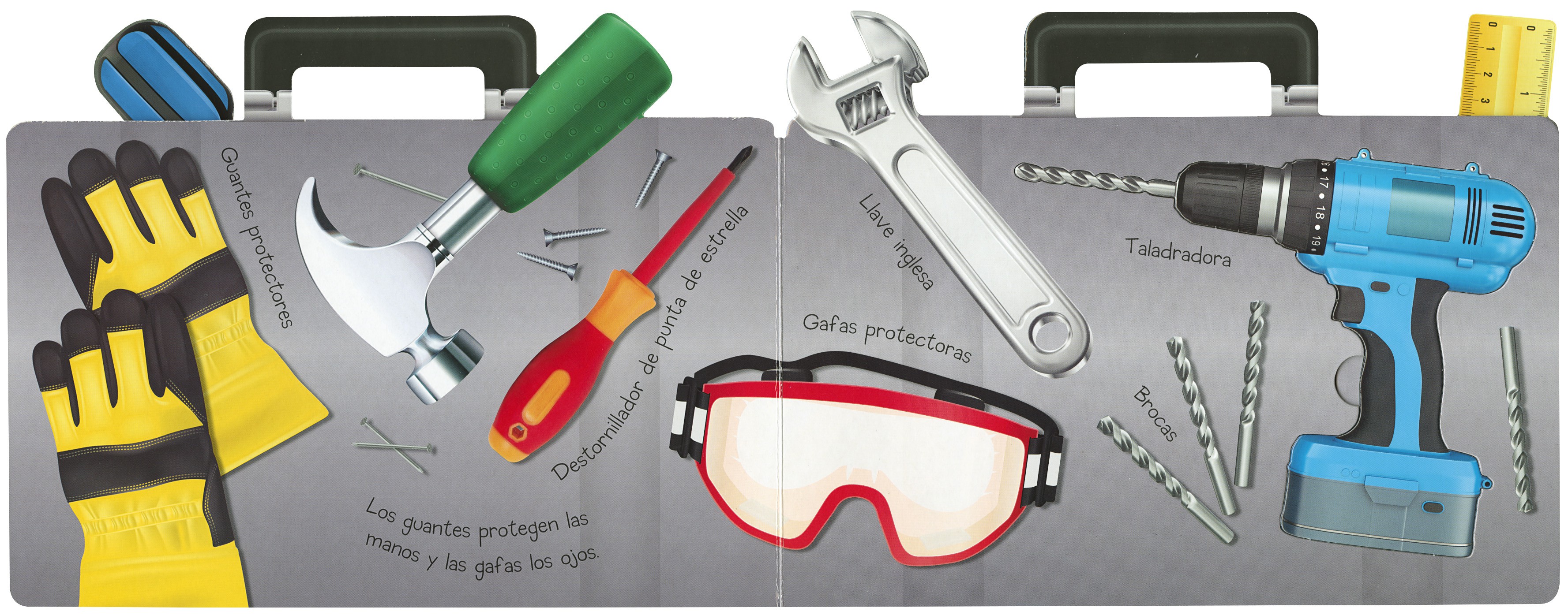 ¿Sabes para qué sirve una llave inglesa o un destornillador? En este práctico libro-maletín, con asa para que puedas llevarlo a cualquier sitio, descubrirás muchas herramientas que usan los albañiles para trabajar. ¡Abre la caja de herramientas y juega!