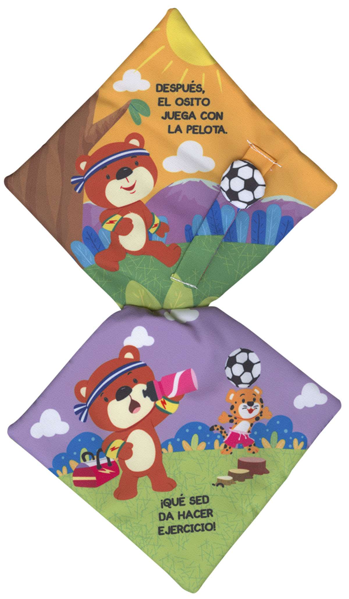 Encuadernación: Libro de tela acochada con cabecita de oso sonajero y tira para colgar con velcro