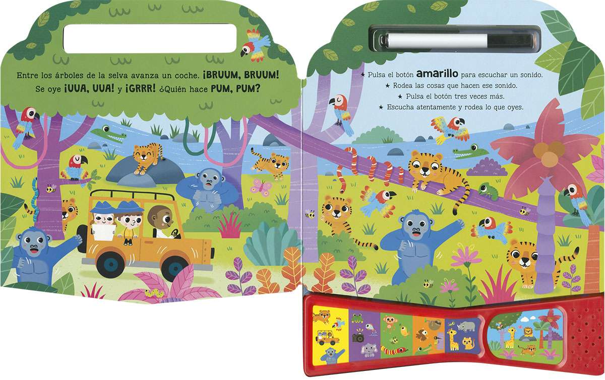 ¿Quién hace "grrr"? ¿Qué hace "clic"? Escucha los sonidos, luego busca y rodea con un círculo cada cosa que oigas. Descubre 20 sonidos en esta selva llena de diversión.