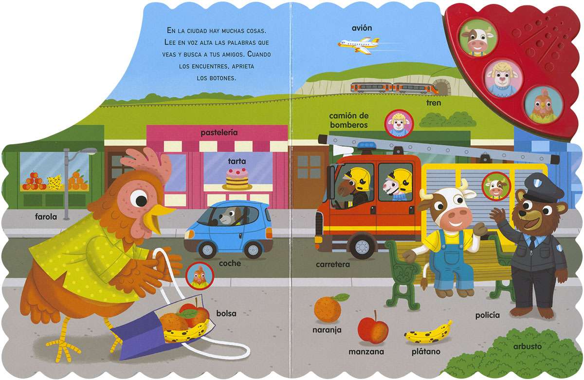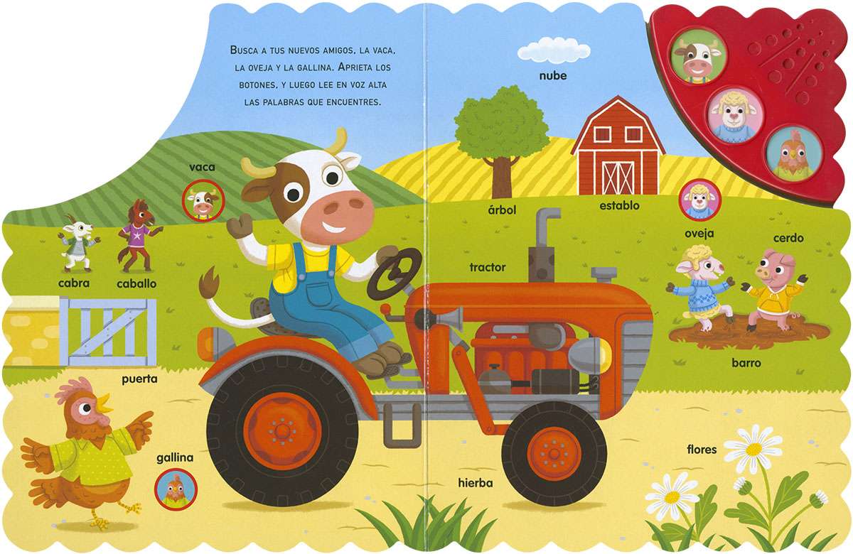 Aprende nuevas palabras con este divertido libro de cartón en el que hasta los animales de la granja cantan. Disfruta de las ilustraciones y los sonidos ¡y aprende vocabulario!