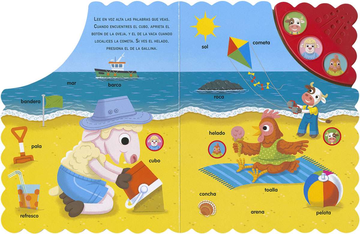 Encuadernación: Libro de cartón plastificado brillo y troquelado con módulo con 3 pulsadores sonoros