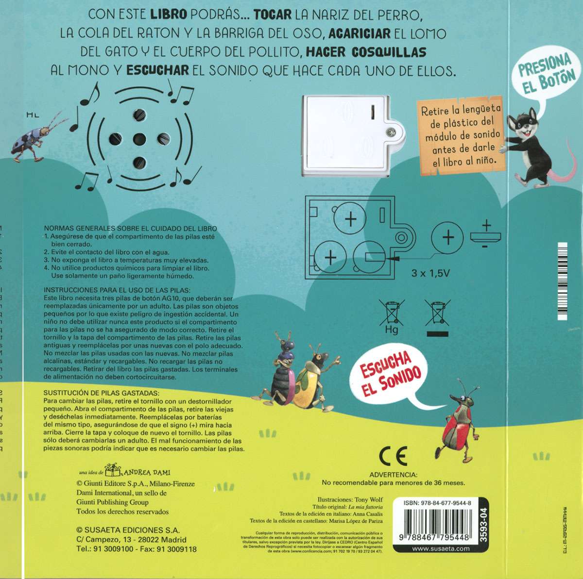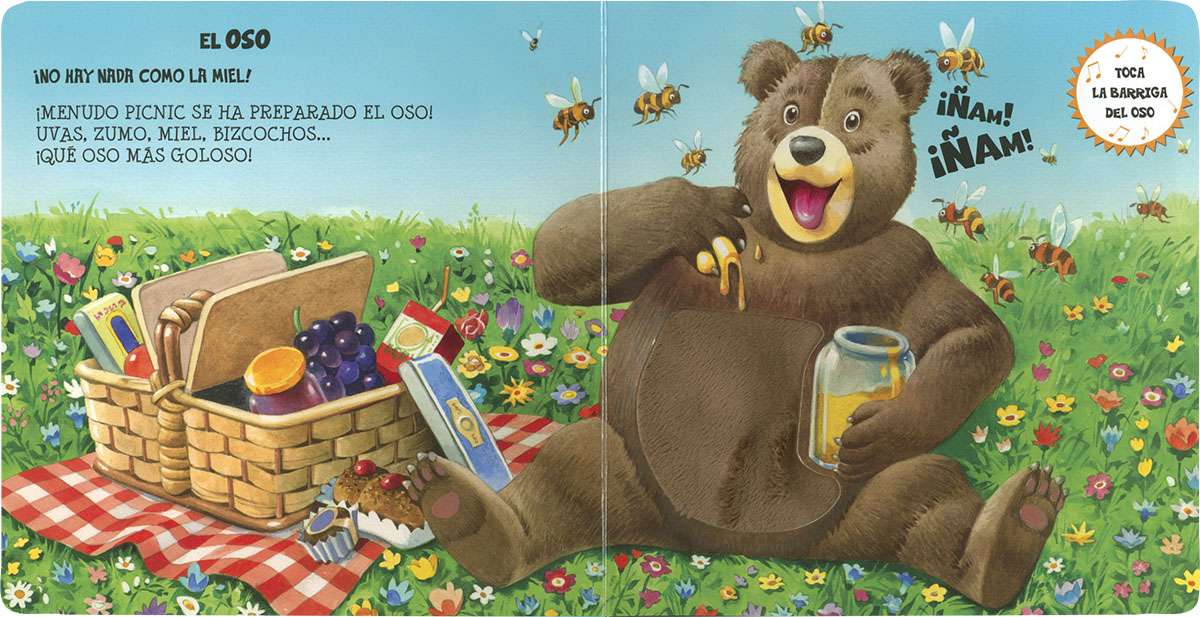 Este precioso libro de simpáticas ilustraciones incluye texturas y sonidos para que puedas tocar la nariz del perro, la cola del ratón y la barriga del oso, acariciar el lomo del gato y el cuerpo del pollito o hacerle cosquillas al mono,mientras escuchas al mismo tiempo el sonido que hacen cada uno de estos animales.