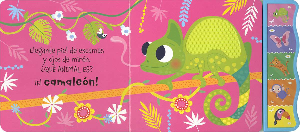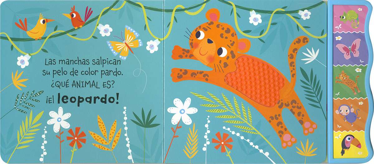Descubre nuevas sensaciones con este libro de texturas de silicona. Pulsa los botones y escucha los sonidos de la selva con este libro ideal para estimular el aprendizaje más temprano. Un regalo muy especial para niños y niñas que desean conocer el mundo.