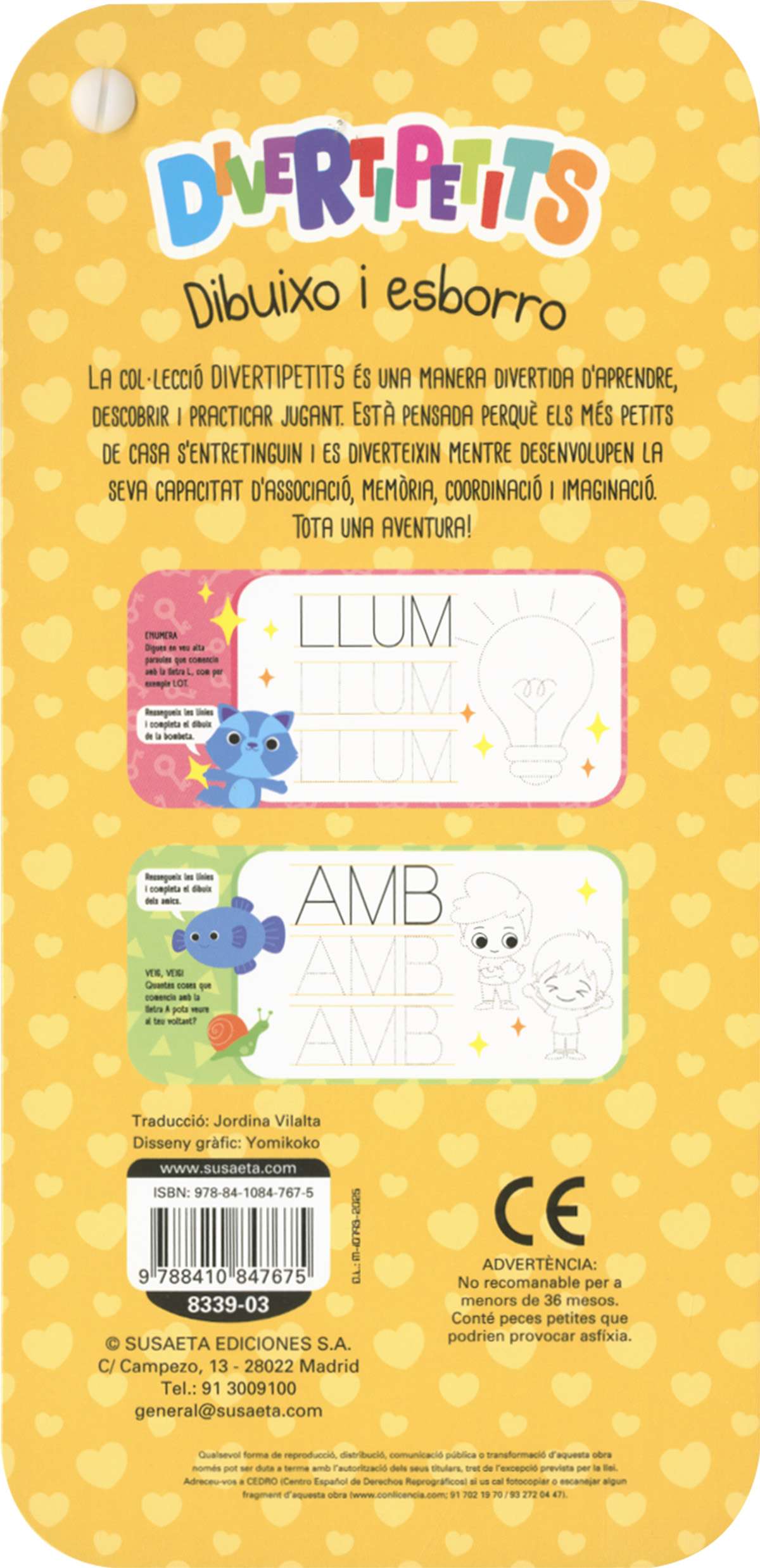 Una manera divertida daprendre, descobrir i practicar jugant. La col·lecció DIVERTIPETITS està pensada perquè els més petits de casa sentretinguin i es diverteixin mentre desenvolupen la seva capacitat dassociació, memòria, coordinació i imaginació. En aquests títols hi trobaràs activitats per observar, identificar i practicar les lletres majúscules, a més de jocs i passatemps relacionats amb les majúscules per compatir i divertir-te. No et preocupis si alguna cosa no et surt a la primera; amb el retolador esborrable ho podràs escriure i esborrar tantes vegades com vulguis.