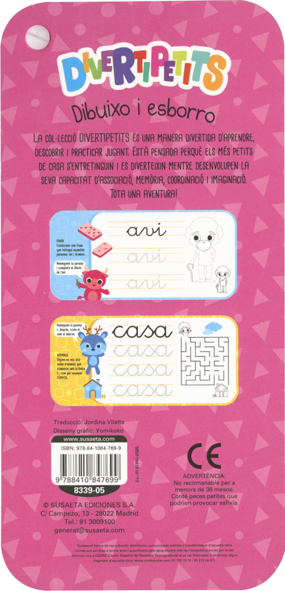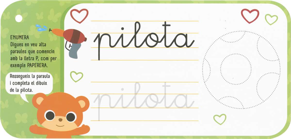 Una manera divertida daprendre, descobrir i practicar jugant. La col·lecció DIVERTIPETITS està pensada perquè els més petits de casa sentretinguin i es diverteixin mentre desenvolupen la seva capacitat dassociació, memòria, coordinació i imaginació. En aquests títols hi trobaràs activitats per observar, identificar i practicar la cal·ligrafia, a més de jocs i passatemps relacionats amb la cal·ligrafia per compatir i divertir-te. No et preocupis si alguna cosa no et surt a la primera; amb el retolador esborrable ho podràs escriure i esborrar tantes vegades com vulguis.