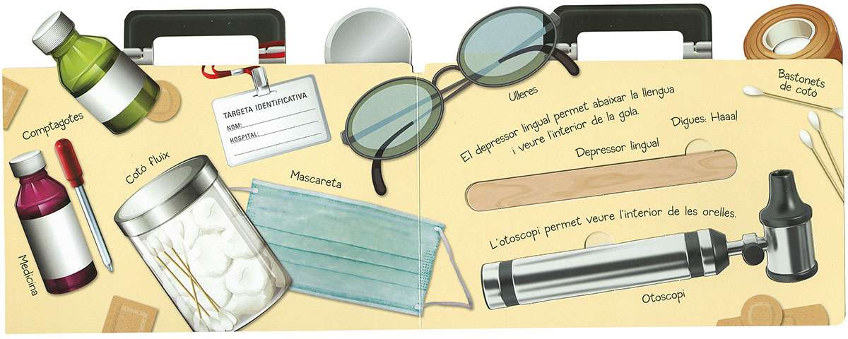 Saps com es diu l'instrument que utilitza el metge per a escoltar el teu cor? En aquest pràctic maletí, amb nansa perquè puguis endur-te'l a qualsevol lloc, descobriràs molts estris que utilitzen els metges en la seva feina. Obre el maletí i juga!