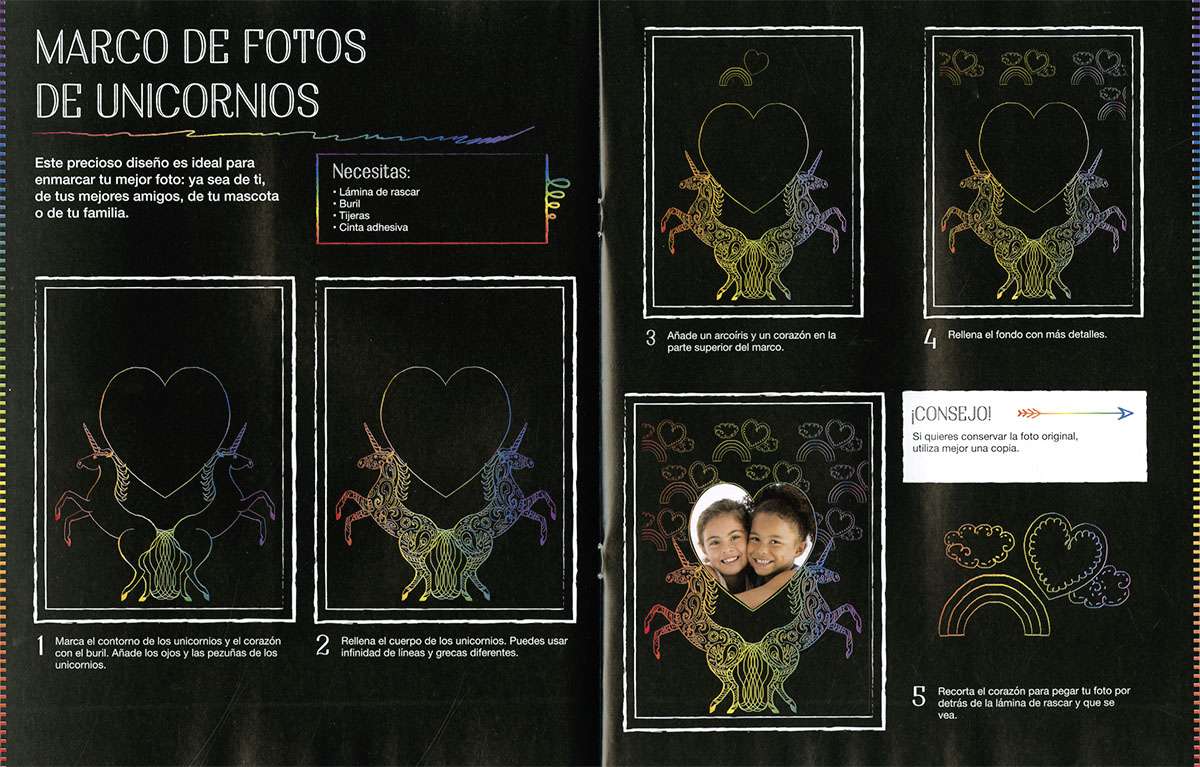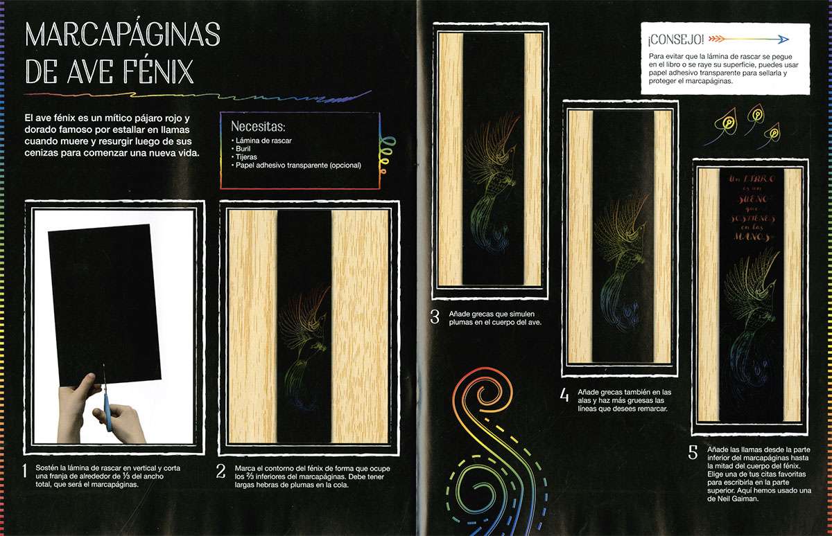 Encuadernación: Cartoné plastif. brillo, incluye láminas para rascar, láminas plantilla, buril y libro de instruccio
