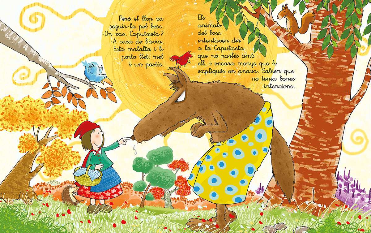 La tendra història de La Caputxeta vermella en una edició a tot color i textos senzills amb lletra manuscrita pensada per als primers lectors.