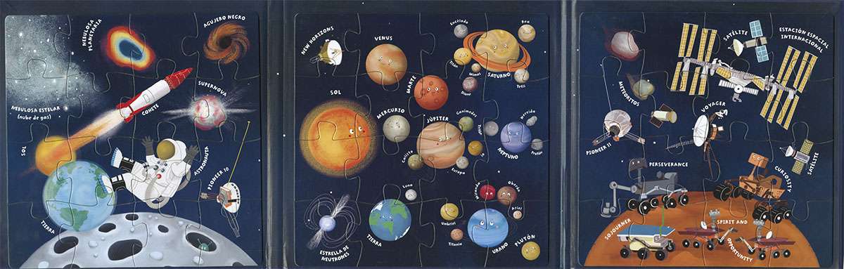 ¿Te gustan los puzles? ¿Y los imanes? ¿Te diviertes con los astronautas, los planetas y las estrellas del cielo? Pues aquí tienes un fantástico libro sobre el espacio que incluye 3 puzles con 16 piezas magnéticas cada uno. ¡Ideal para llevártelo de viaje y jugar con toda la familia!
